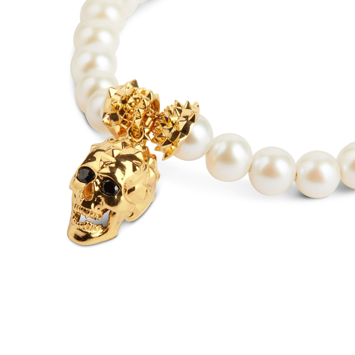 Classic Vampire skull Bracelet with a modern twist. The faceted hanging Vampire Skull charm features deathly black onyx eyes and fanged teeth. Elevated by Fresh water pearls bringing a subtle elegance to this refined bracelet.