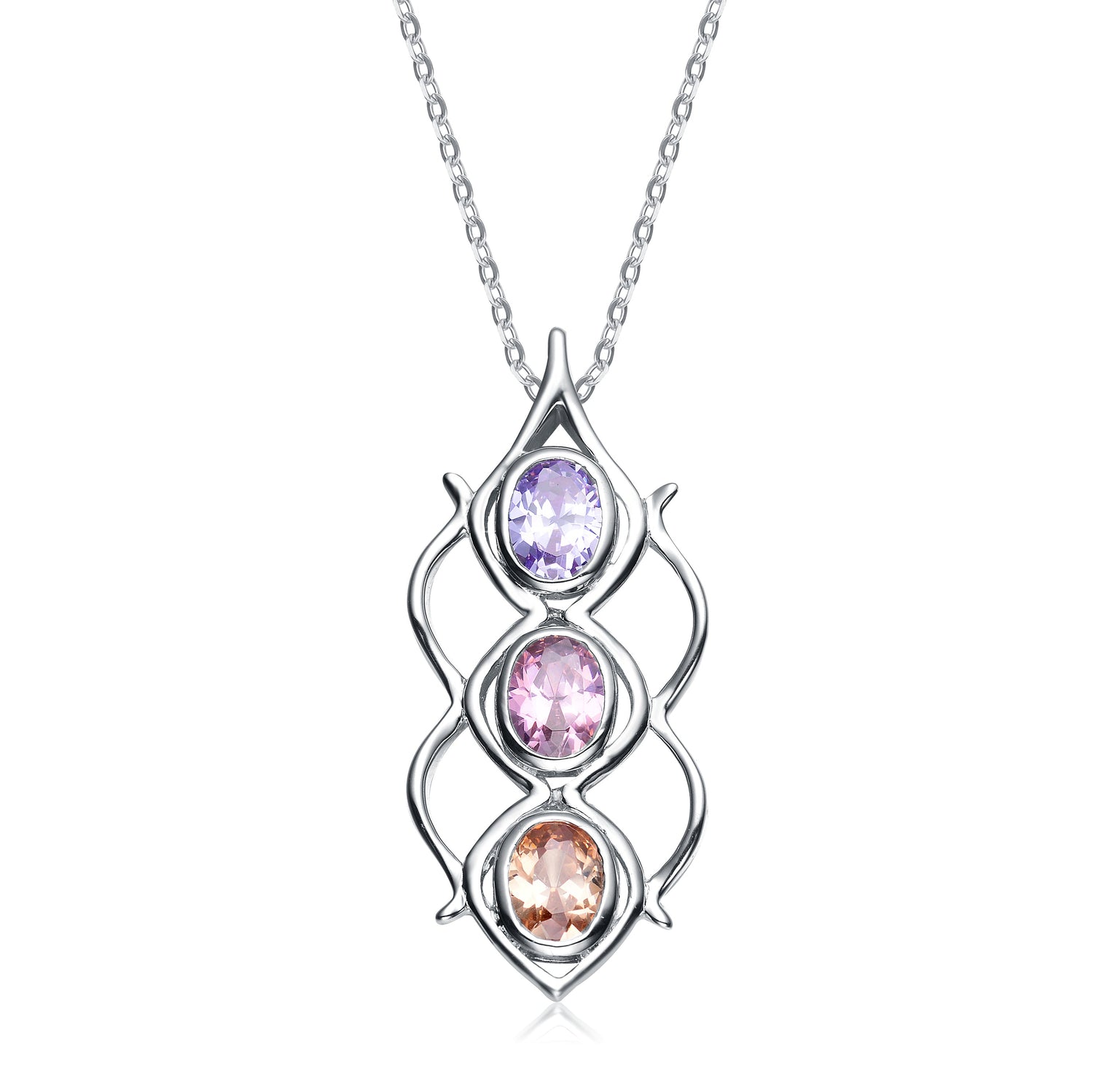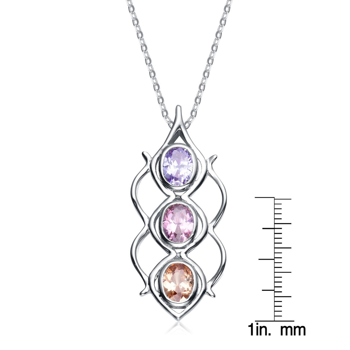This necklace is crafted from sterling silver and features three multicolored circular cubic zirconia stones in a linear design.