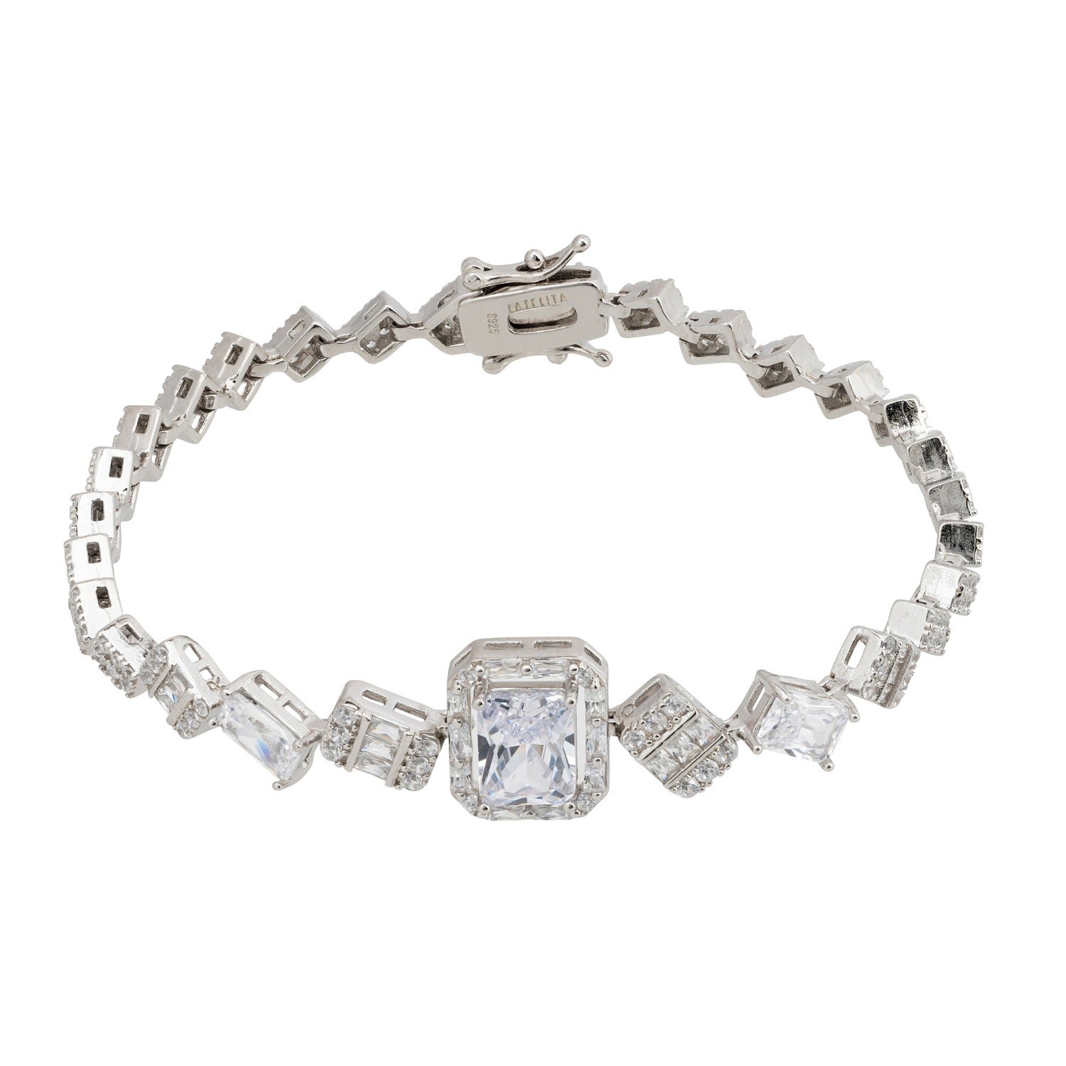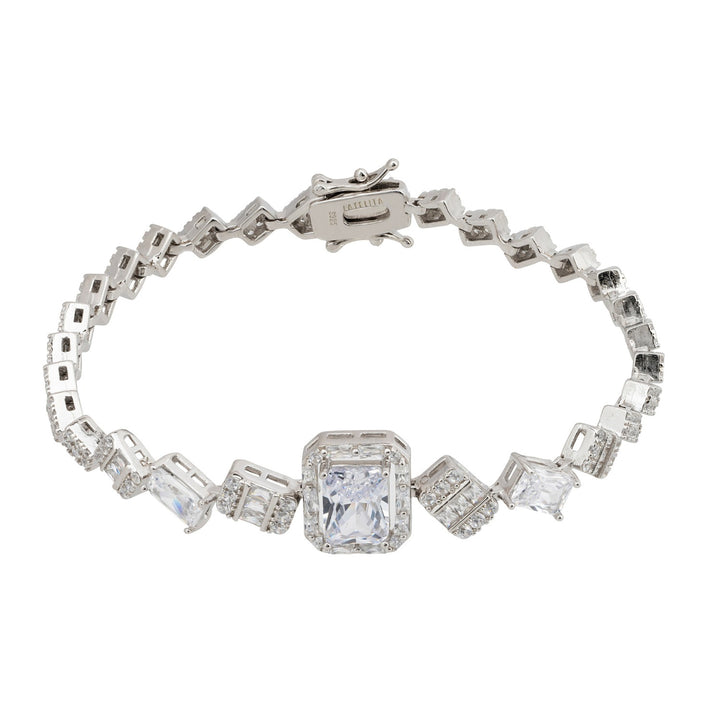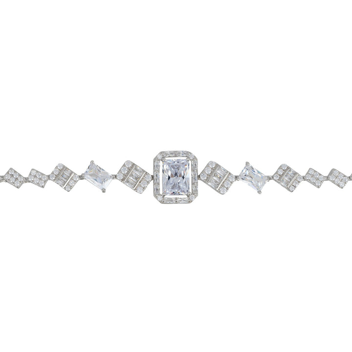 Elevate your elegance with the Crawford Tennis Bracelet in Silver White, a masterpiece of Art Deco elegance. This stunning bracelet is resplendent with simulated diamonds and at its heart lies a large rectangular setting, beautifully flanked by three smaller rectangular settings on each side, each featuring a single gemstone or a cluster of stones. The design continues with the smallest rectangular settings, all adorned with sparkling simulated diamonds, stretching along the remaining length of this gorgeous bracelet. Complete your look with matching pieces from the Crawford range for a seamless, sophisticated style.