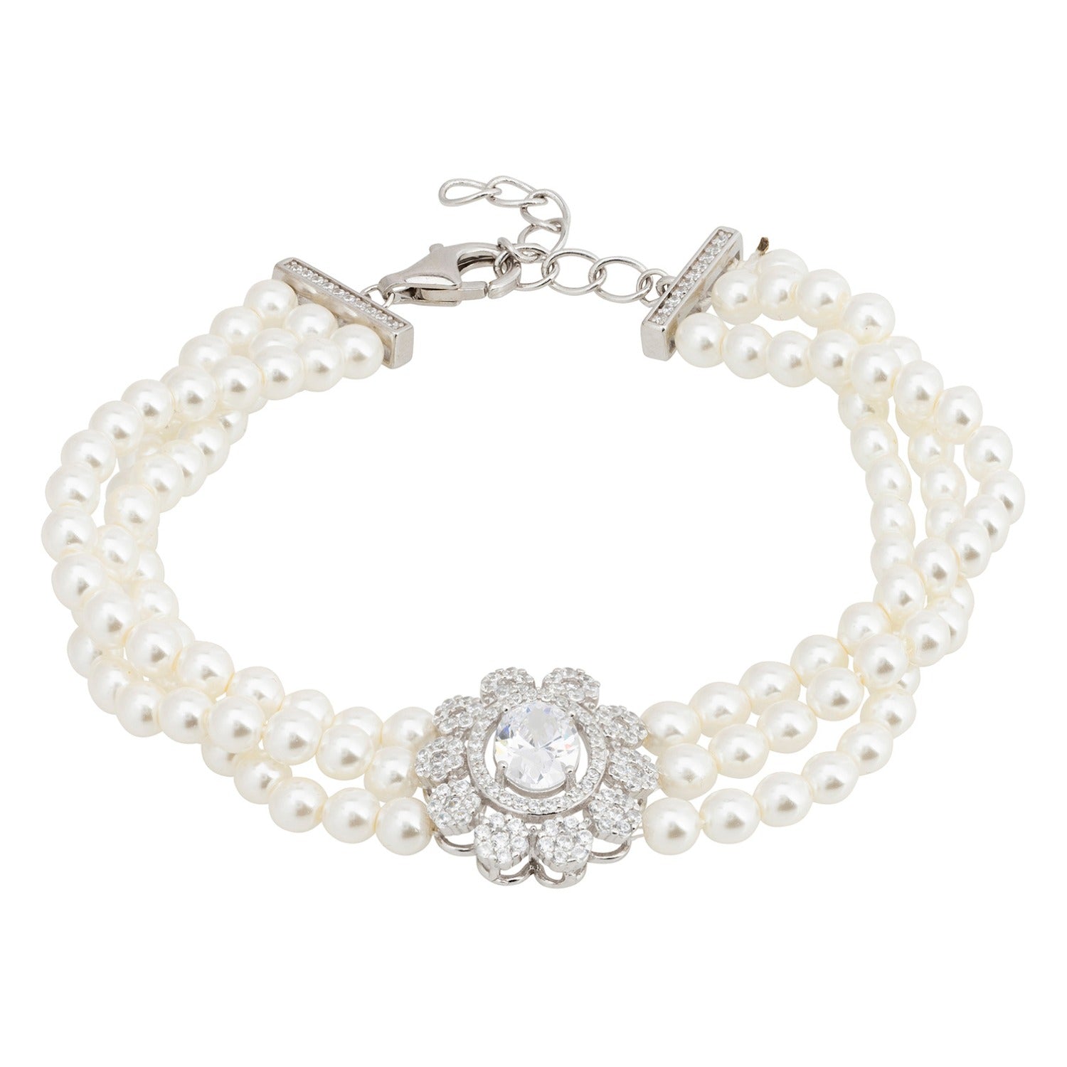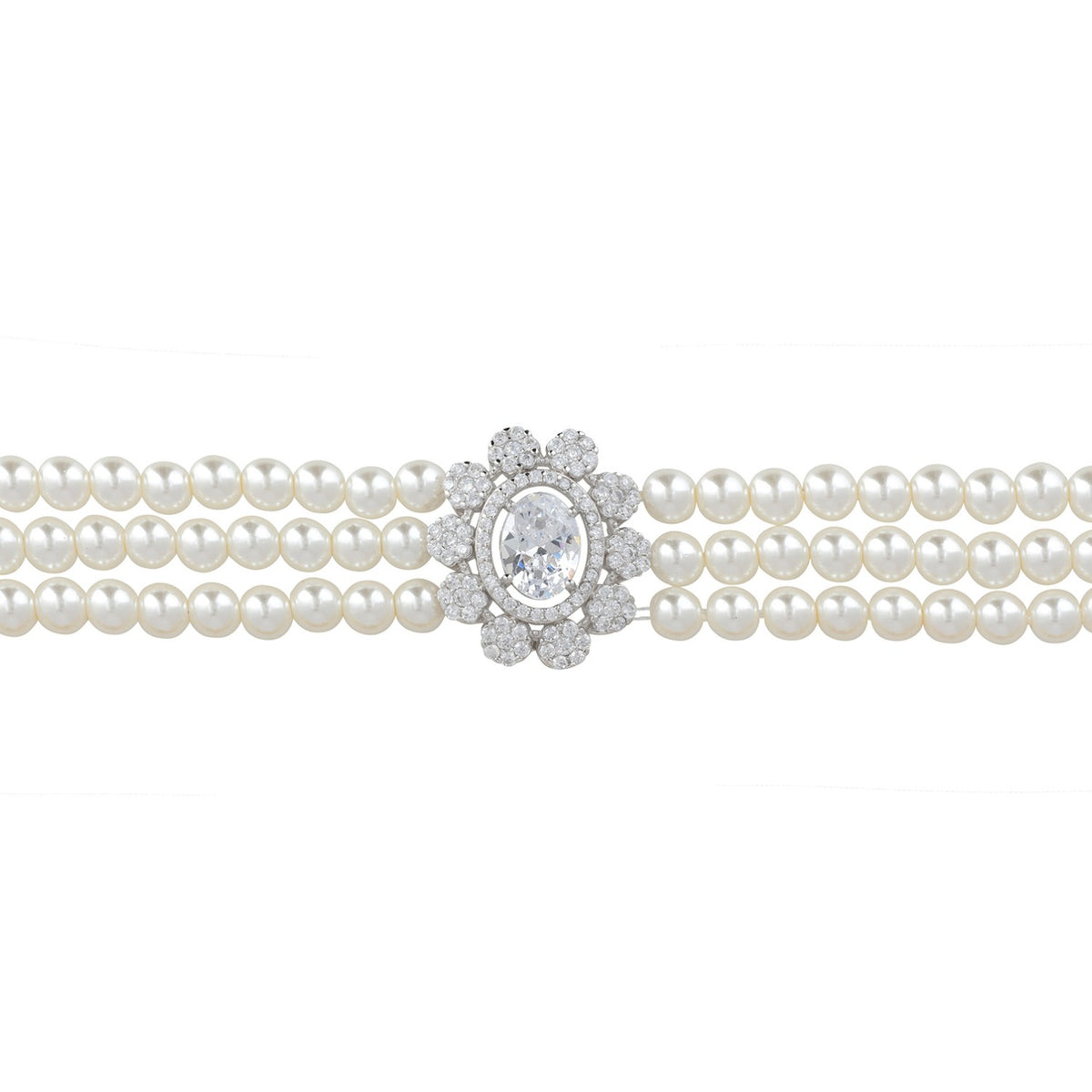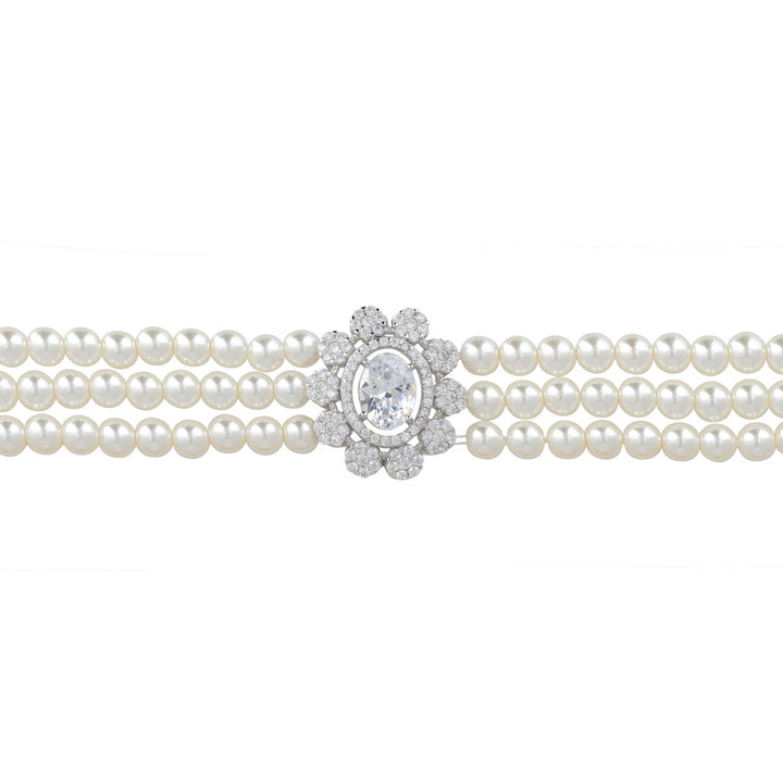 The Spencer Pearl Strand Bracelet is a symphony of luxury, featuring three exquisite strands of luminous pearls that wrap gracefully around your wrist, creating a look that is both timeless and contemporary. The focal point of this stunning bracelet is an enchanting floral-inspired motif, positioned elegantly at the front. At its heart lies a dazzling oval-cut simulated diamond, encircled by a radiant halo of smaller stones that enhance its brilliance. Delicate flowers adorned with simulated diamonds, extend from the centre, adding a touch of whimsy and opulence to this exquisite piece. For those who adore coordinated elegance, the Spencer collection includes the Spencer Pearl Strand Choker Necklace and the Spencer Earrings.
