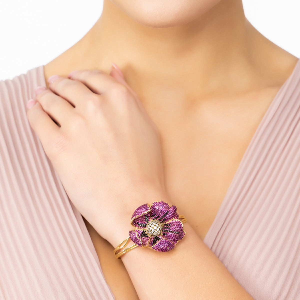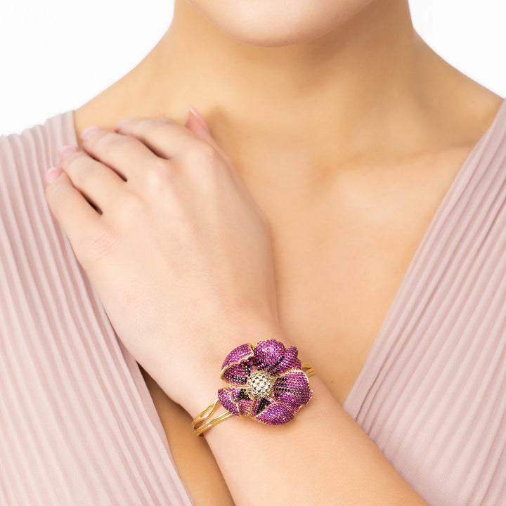 Look fashionable while wearing a timeless accessory with the Poppy Bangle Cuff Bracelet Gold Ruby Red Cz. Whether you’re looking to complete your everyday look or make a bold entrance at an event, this bangle cuff will make all heads turn. Poppies are symbols of sleep and regeneration, on a spiritual level, poppies symbolize the eternal life of the soul, including reincarnation. A red poppy flower can be given to somebody to symbolize undying love. Intricately detailed with a three-dimensional poppy flower adorned with ruby red, black and white cubic zirconia, this piece will be sure to add some dazzling charm to any outfit. If you're looking for fashion that speaks volumes without uttering a single word, then this exquisite design belongs on your arm!