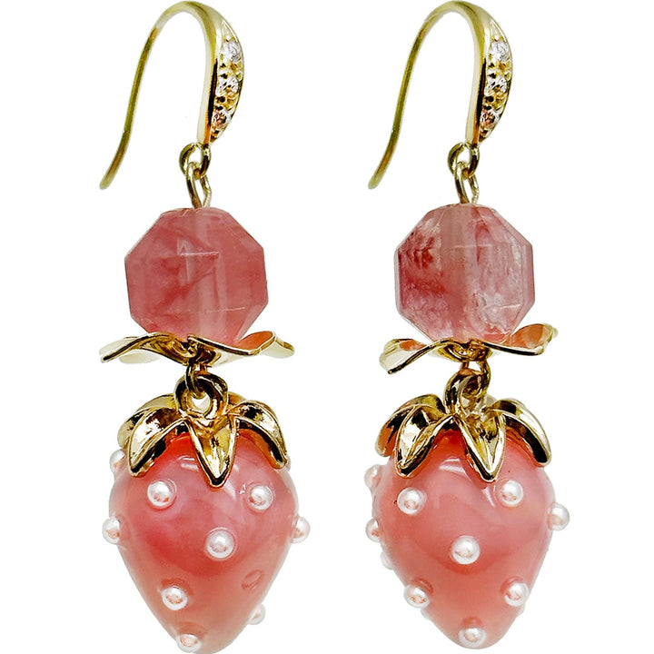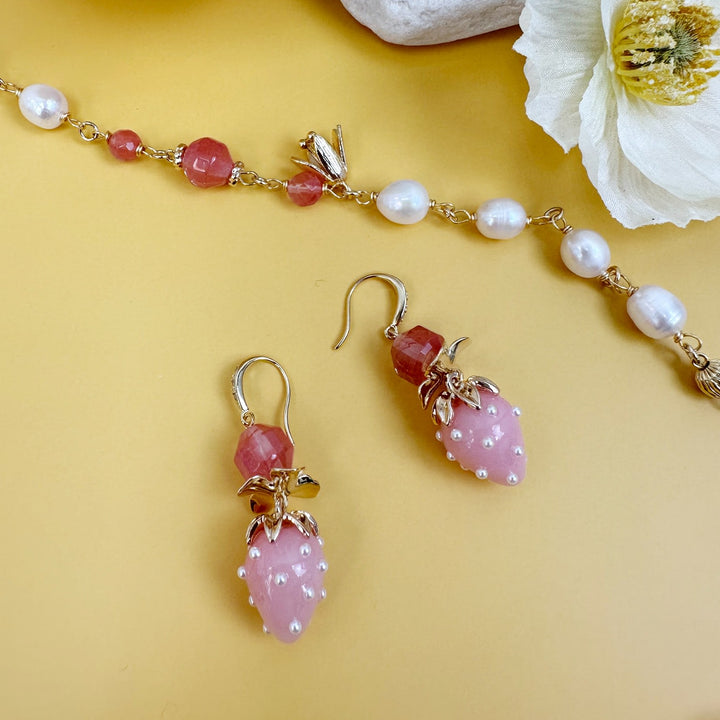 These dangle earrings are crafted with watermelon quartz and a strawberry glass charm.