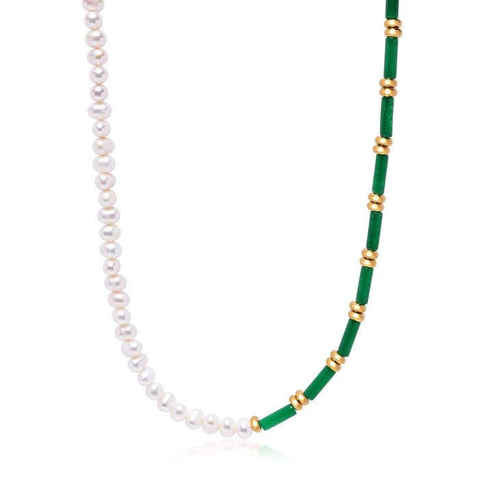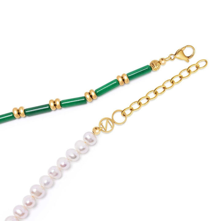 This Pearl Choker with Green Agate by Nialaya is a piece that embodies contrast and confidence. It pairs delicate freshwater pearls with bold green agate stones to create a choker that is both timeless and daring. The pearls offer softness and elegance, while the vibrant green agate adds an earthy touch. It's a statement piece that stands out, whether worn layered or solo, and is made for those who appreciate a classic with a twist.
