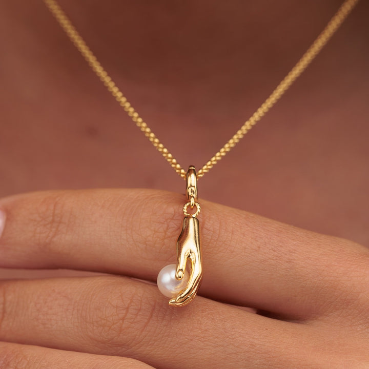 This Gold Plated Hand And Pearl Charm Necklace by Lily Charmed is an elegant and unique accessory that blends vintage charm with timeless style. The necklace features a sculpted hand charm that gently cradles a polished pearl, known as the "Queen of Gemstones." The pearl symbolizes elegance and tradition, making this a thoughtful and sophisticated gift for special occasions like a June birthday or for a bridesmaid.