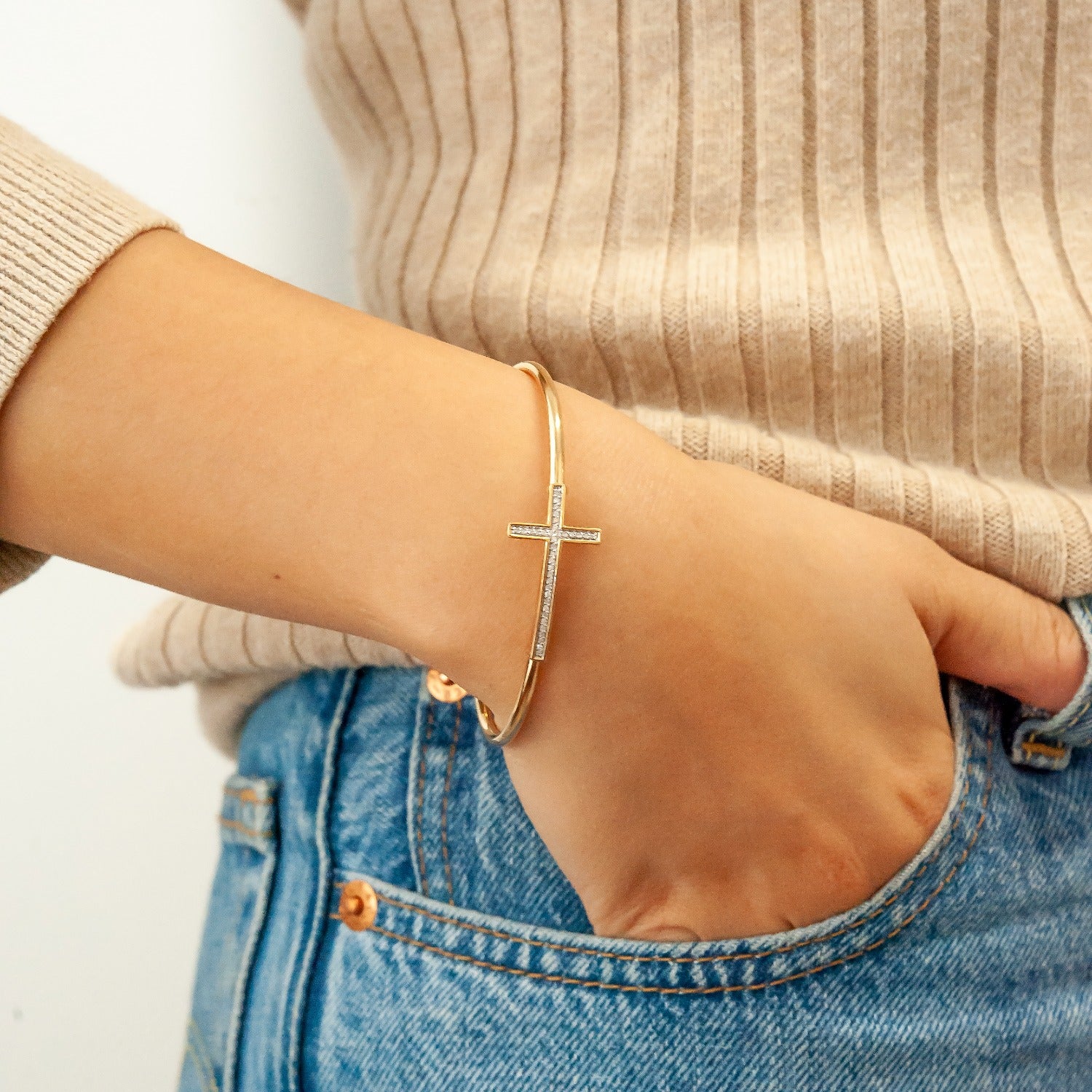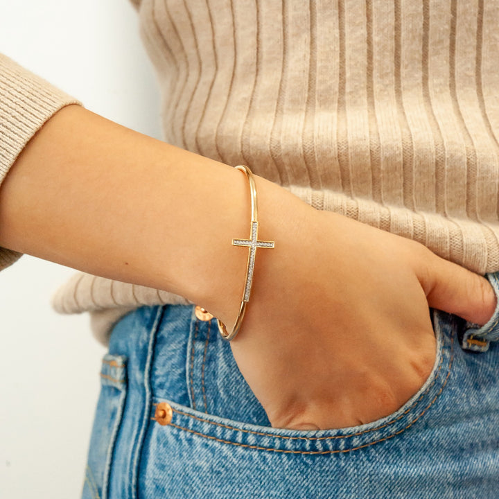 Miki & Jane's most popular bangle bracelet! The Bruna is a customer favorite with its delicate cross adorned with several black diamonds. The flexible Bruna black diamond cross bangle bracelet is a symbolic addition to your collection.