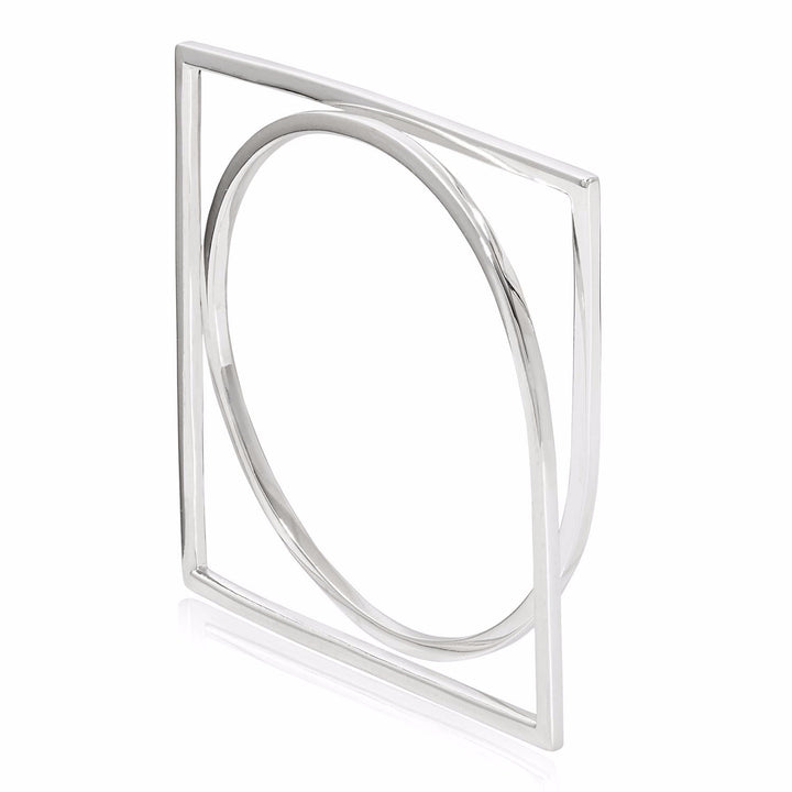 This Sterling Silver bangle has a contemporary and unique design. It is the perfect accessory to make a statement. The handmade bangle consist of a continuous loop of two bracelets, one has a rectangular shape and the other a round one. Another interesting aspect of the designer piece is the combination of different finishes, varying between polished and satin surfaces. The bangle is very versatile and can be worn with anything to any occasion, adding style and sophistication to your outfit. This bangle have been handmade by our artisan craftsmen using only the finest precious metals. This jewellery piece is the perfect gift or treat for you. Everyday luxury with a twist.