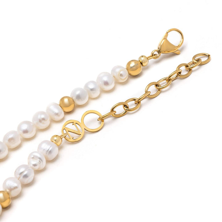 This handmade necklace features cultured baroque white freshwater pearls, assorted dice beads, and gold-plated stainless steel with cubic zirconia gold-plated beads.