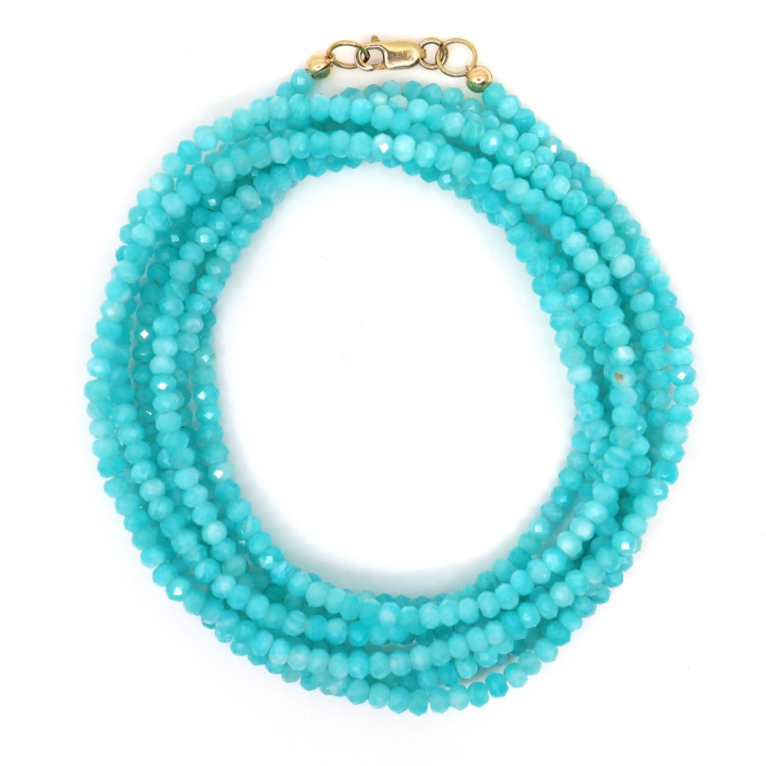 Faceted amazonite wrap bracelet — A gemstone known for its vibrant teal hues, reminiscent of tropical waters. This stunning piece celebrates the beauty of nature's palette, encouraging you to embrace the vibrant colors of the world. The details - Strung on satin gold wire and 14K gold filled spring clasp closure hook. Gemstones in their natural form are imperfect as such, no two stones are alike which add to the character and the beauty of the stone. One-of-a-kind. Made in Canada.