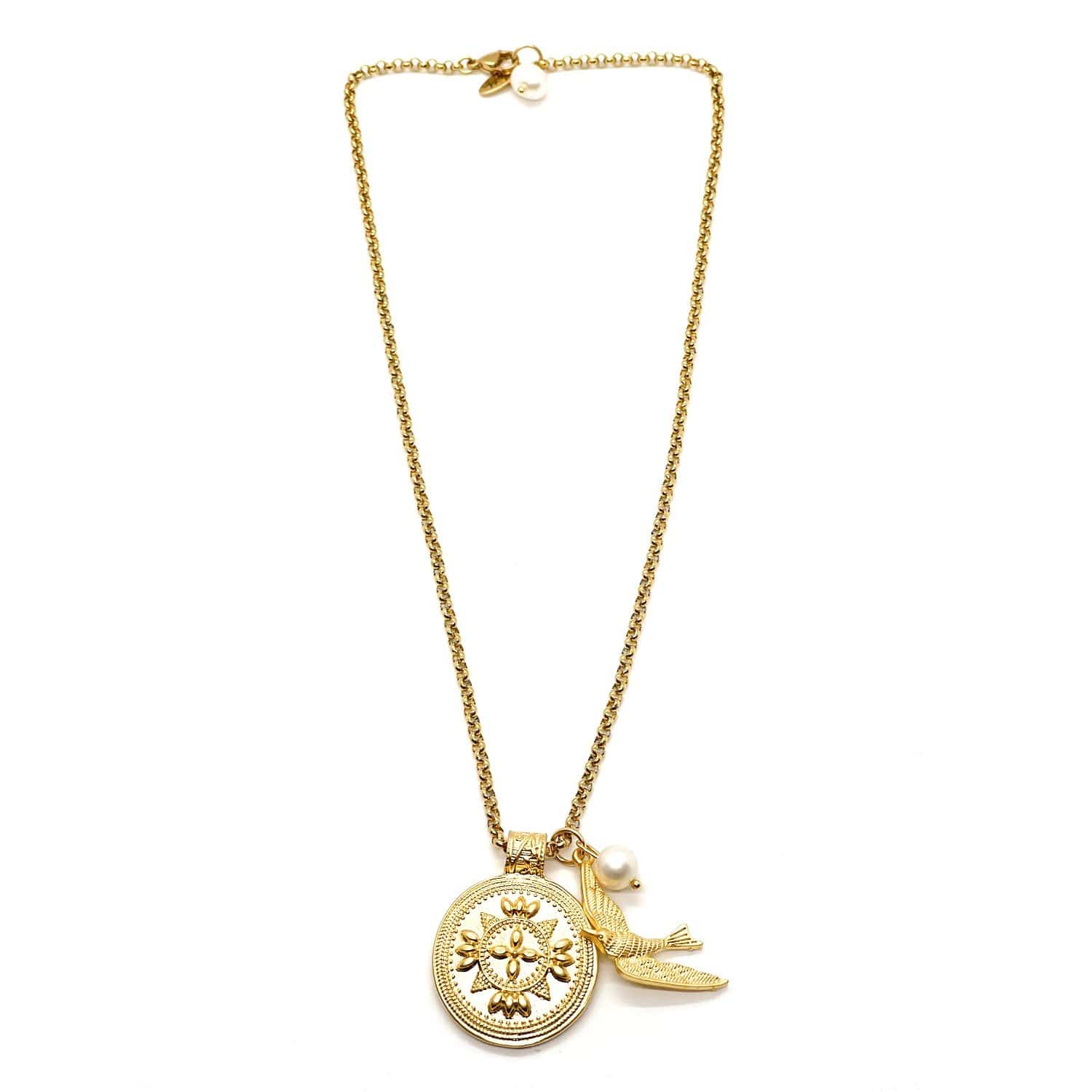 18k gold-plated stainless steel chain with 22k gold-plated brass swallow bird and medallion pendants, accented with freshwater pearls. Handmade.