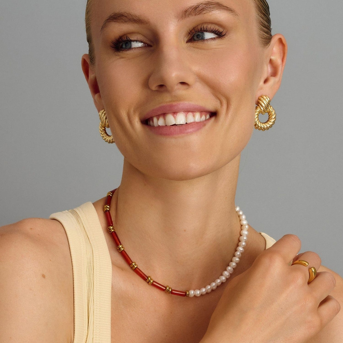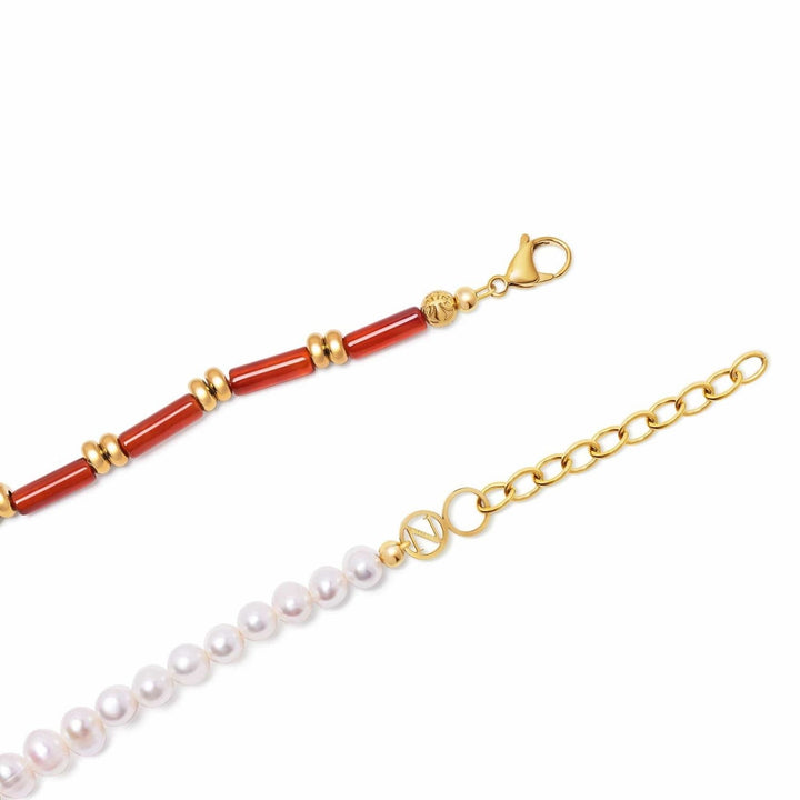 This Pearl Choker by Nialaya is all about contrast and confidence. It pairs delicate freshwater pearls with bold red agate to create a choker that feels both timeless and daring. The pearls bring a soft elegance, while the vibrant red stones add fire and intention, making it a piece that stands out, whether worn solo or layered. This choker is perfect for those who like their classics with a twist.