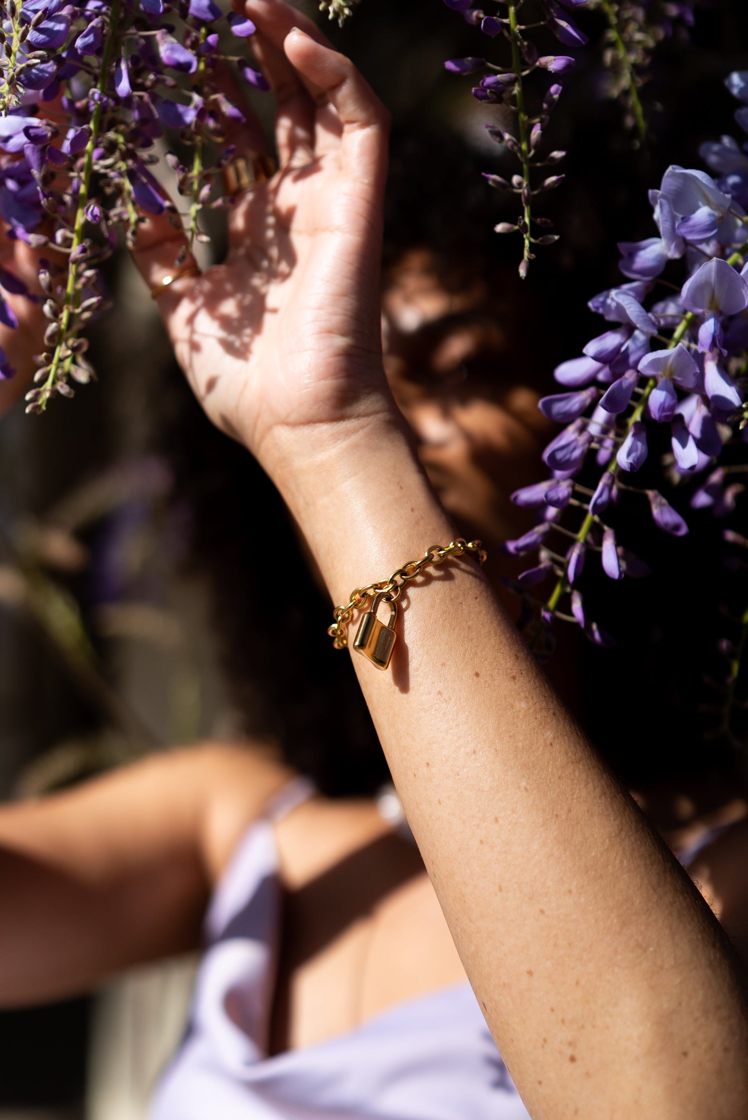 Complete your look with our chic padlock bracelet, designed to be worn on its own or stacked with your favorite bracelets. You can also wear together with our Bella necklace.