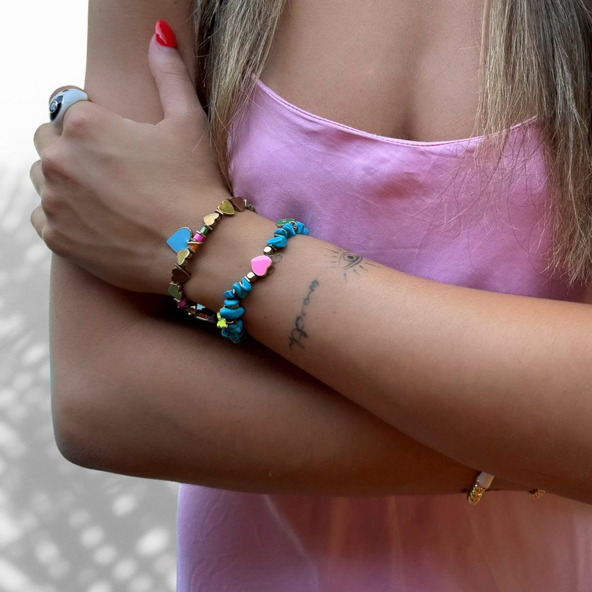 This bracelet is made with 18K Gold plated blue enamel heart charm, gold hematite stone, and multicolor pearl spacers. The bracelet size is 6.5 inches.