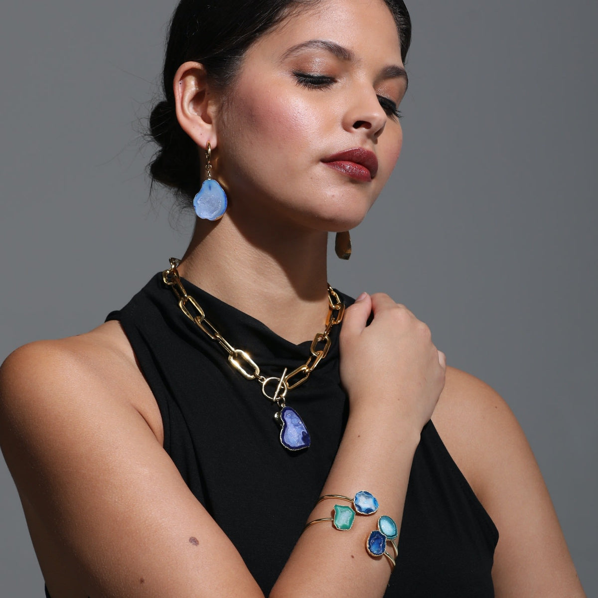 This Aqua & Sea Green Adjustable Bangle by Magpie Rose is a standout accessory that is perfect for making a colorful statement. The stunning and unusual aqua & sea green agate cave stones have natural sparkly druzy inclusions, adding a unique and fashion-forward edge to your piece. Beautifully 18ct gold plated vermeil, this adjustable bangle celebrates the natural variations of the semi-precious gemstones.