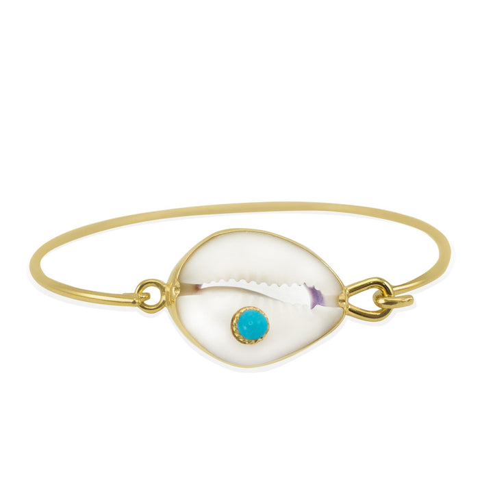 Minimal enough for you to wear everyday, this cuff bracelet from our Marina collection is made from 18k gold over silver featuring a cowry shell marked with a turquoise bead. A must-have for this season.