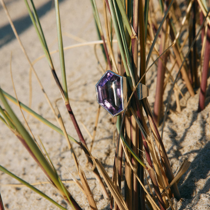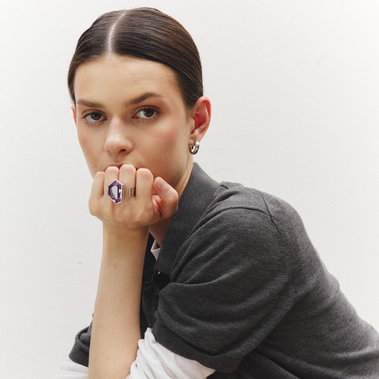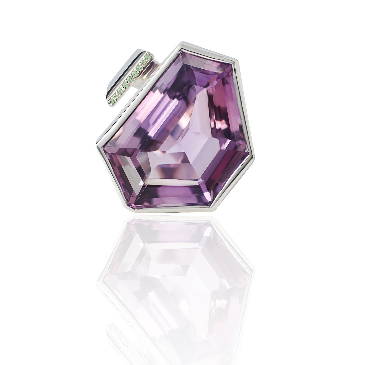 Sterling silver cocktail ring with natural purple Amethyst and top grade brilliant-cut Tsavorites. Designed to attract attention on your night out or dinner date. Pair with jeans or a classic little black dress.
