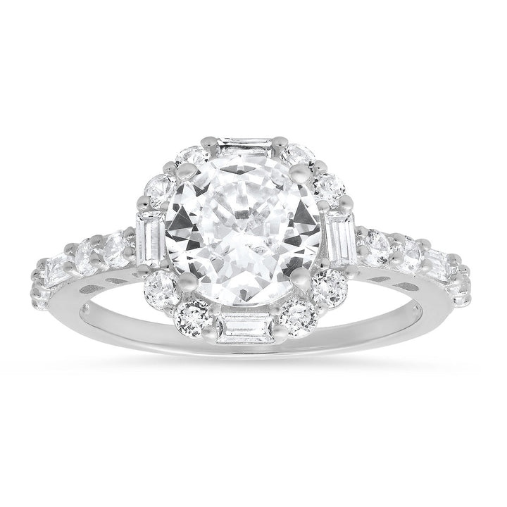 This Sterling Silver Round & Baguette-Cut Halo CZ Ring exudes elegance and sophistication. Crafted from high-quality sterling silver, this ring features a stunning halo design adorned with both round and baguette-cut Cubic Zirconia Stones. The combination of these sparkling stones creates a mesmerizing effect, catching the light from every angle. The halo setting enhances the brilliance and presence of the center CZ stone, making it the focal point of the ring. Perfect for special occasions or everyday wear, this ring adds a touch of glamour and refinement to any ensemble. Elevate your style with this timeless piece of jewelry that effortlessly combines classic charm with modern flair.