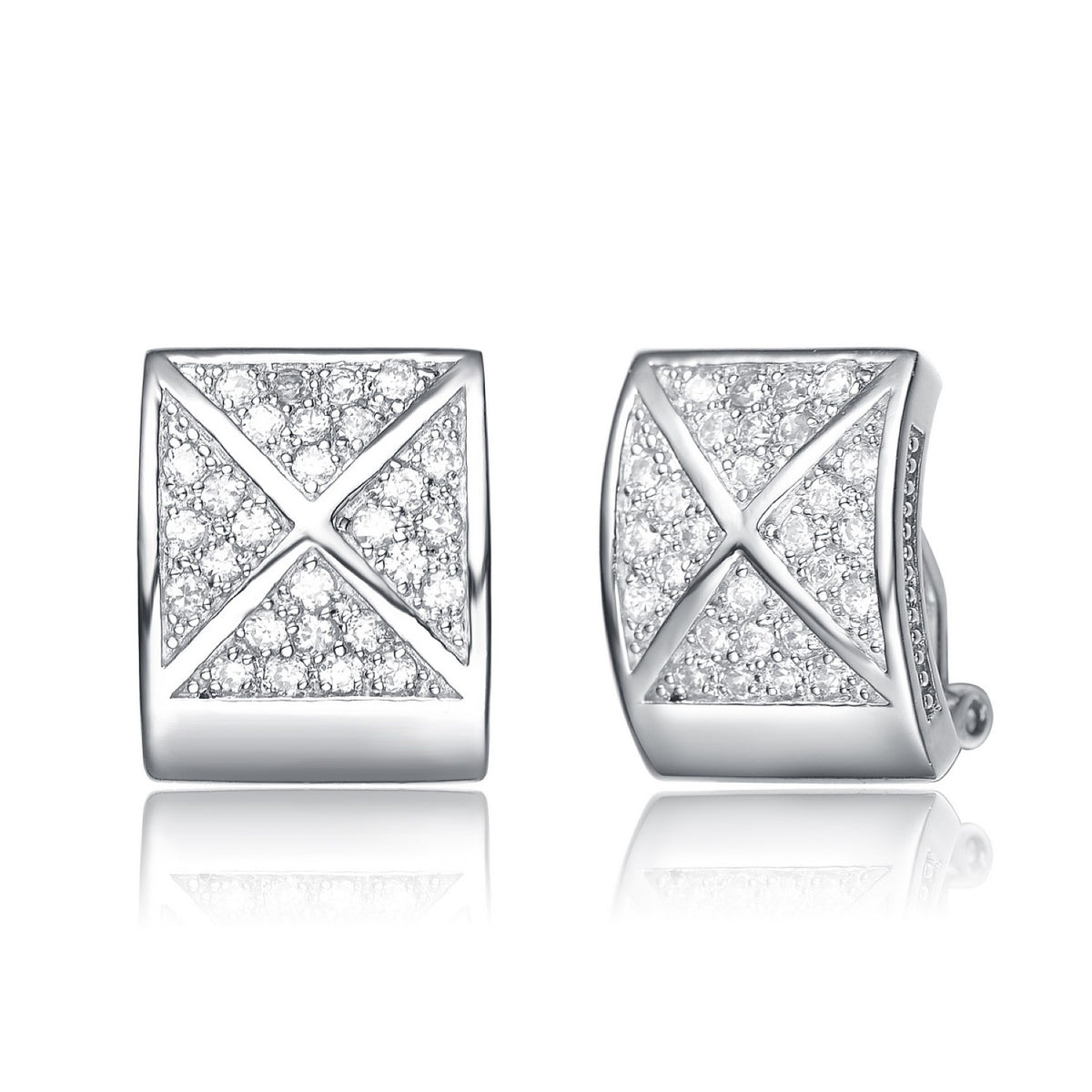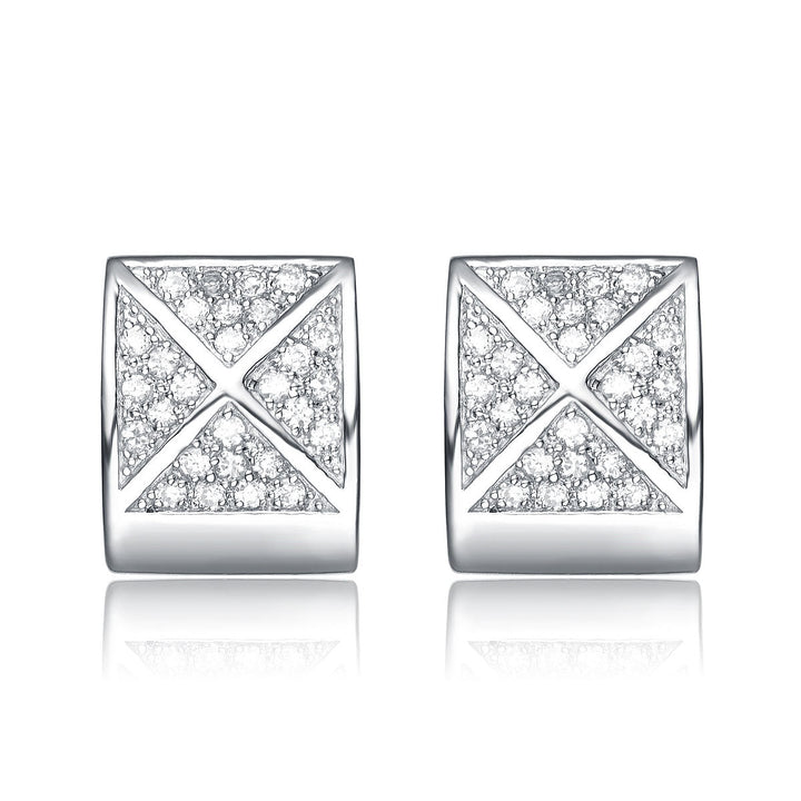 These stud earrings are made from sterling silver and feature cubic zirconia stones. They have a square, geometric shape with an "X" pattern.