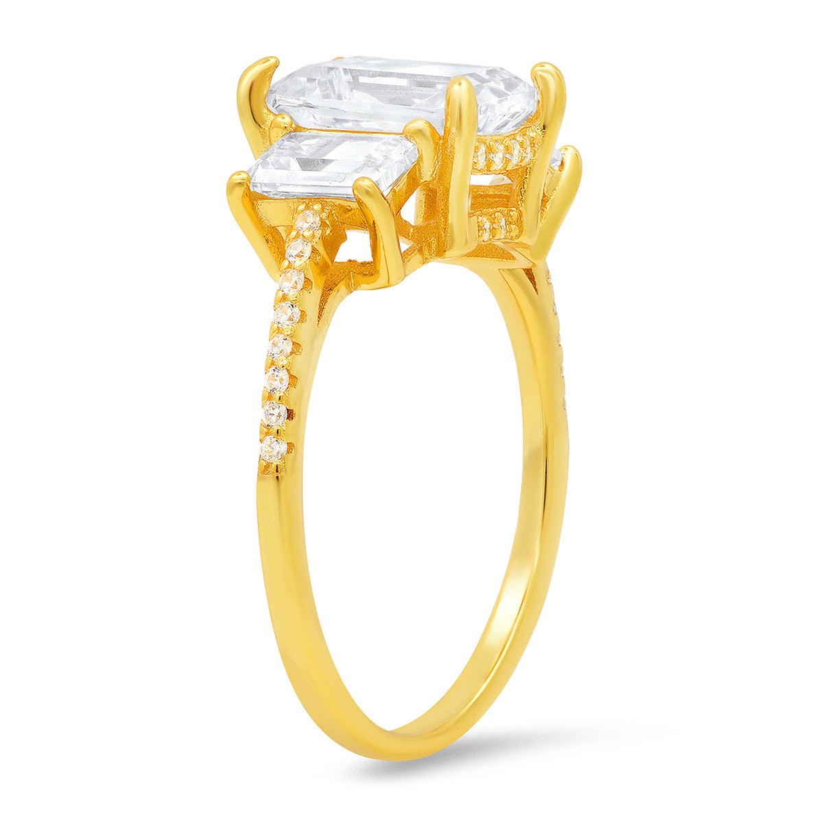 Gold Three Stone Emerald Cut Cz Statement Ring