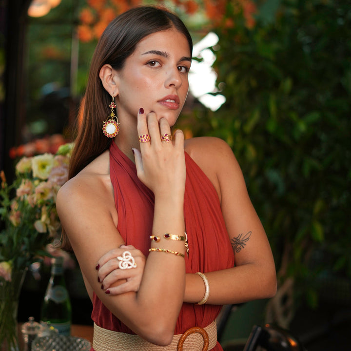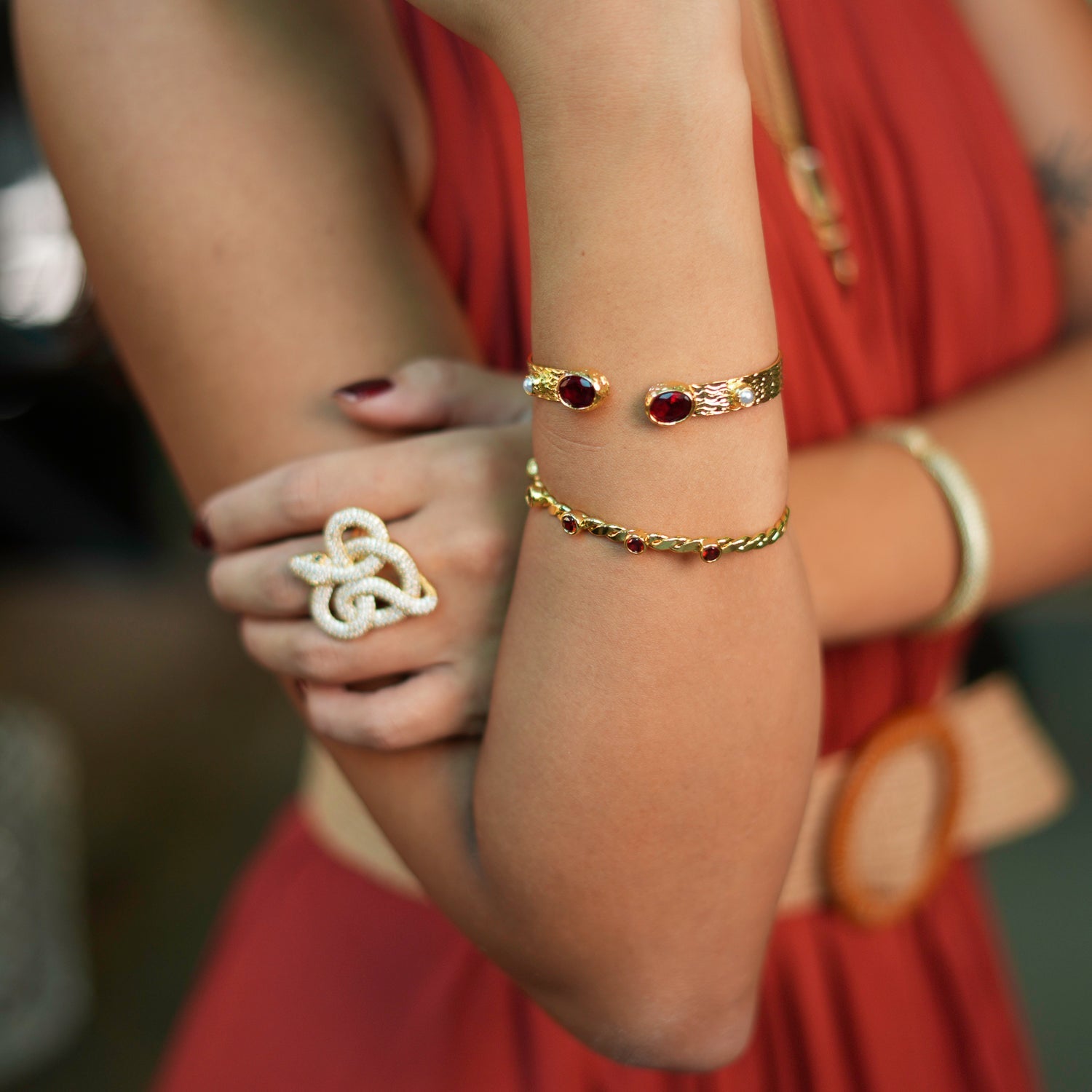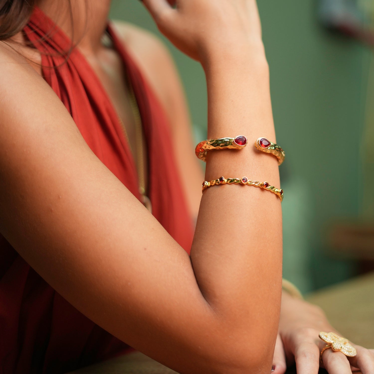 This adjustable cuff bracelet is crafted from brass with 24k gold plating and is set with delicate ruby stones.