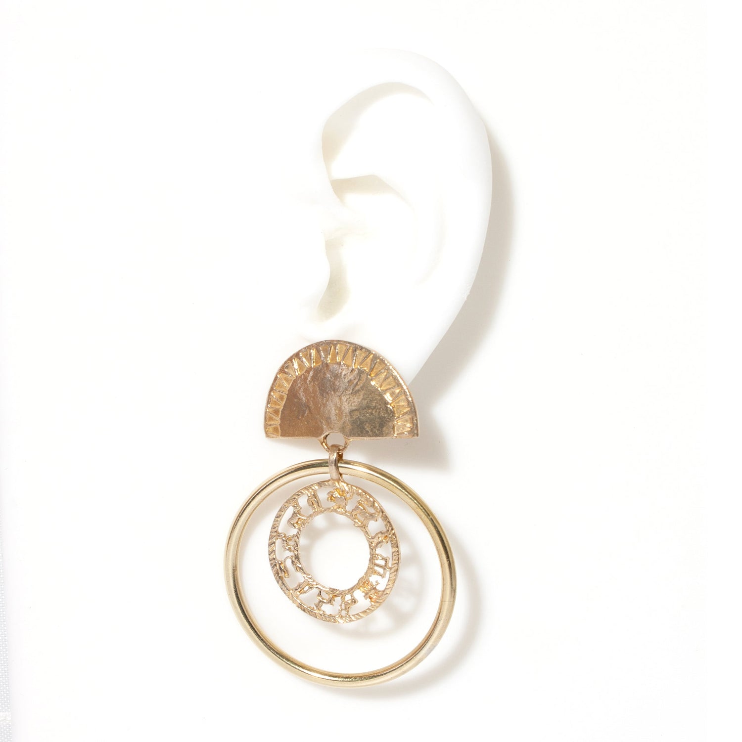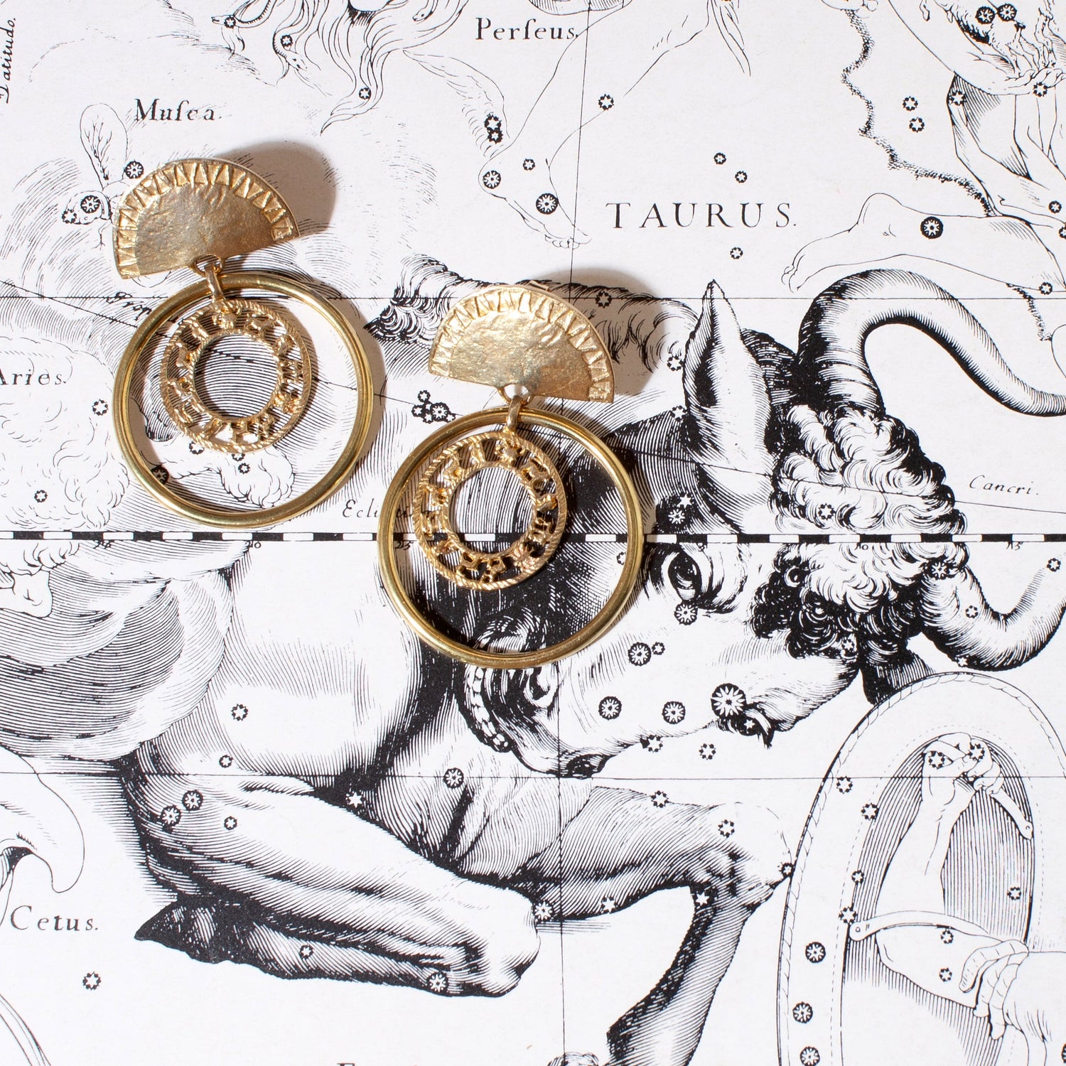 The Celeste Earring by Castlecliff is inspired by the Zodiac Collection. It features abstract sundial-inspired coins and a zodiac calendar charm. These earrings are cast from certified 100% recycled brass using the ancient art of lost wax casting, combined with upcycled and vintage materials, and finished with a sterling silver post. Each piece is handcrafted in NYC.