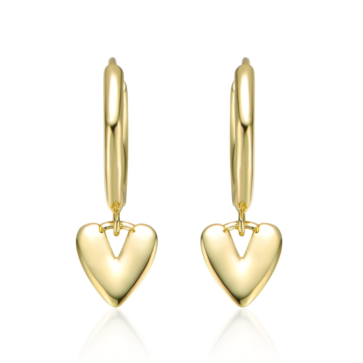 These Yellow Gold Plated Heart Dangling Earrings by Genevive Jewelry radiate timeless charm. The 14k yellow gold-plated heart dangles gracefully from a hinged hoop clasp, adding a touch of sophistication to your style.