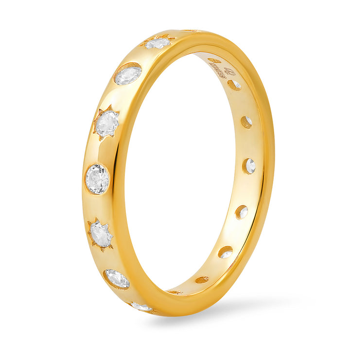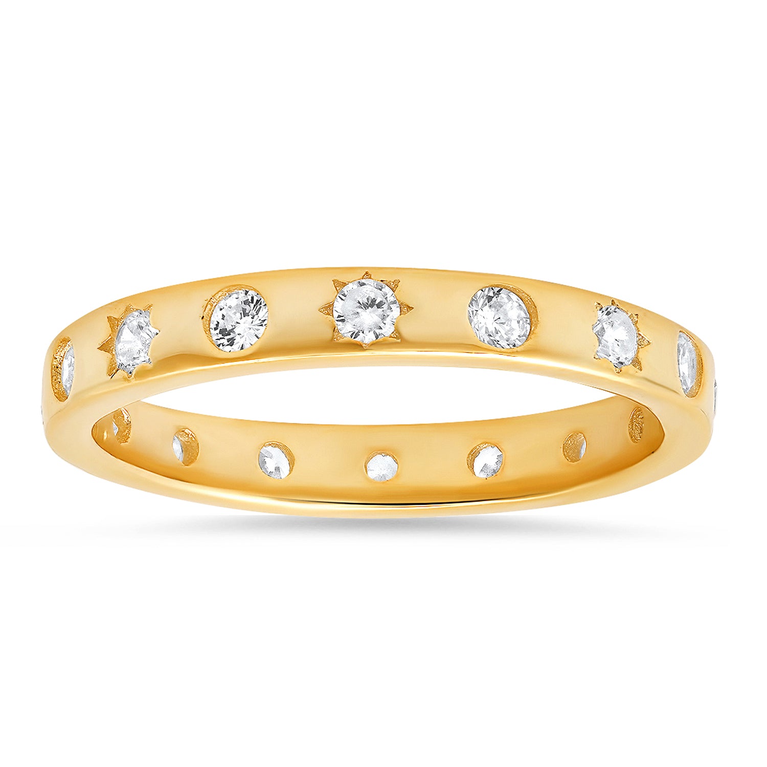 This Gold Celestial CZ Stackable Eternity Band Ring is an elegant piece featuring a celestial-inspired design.