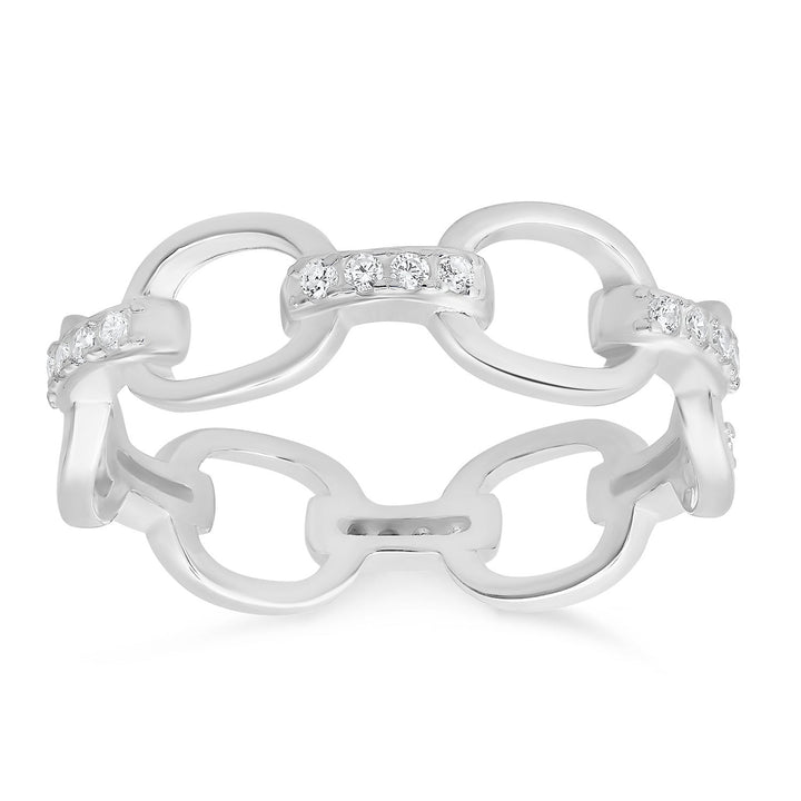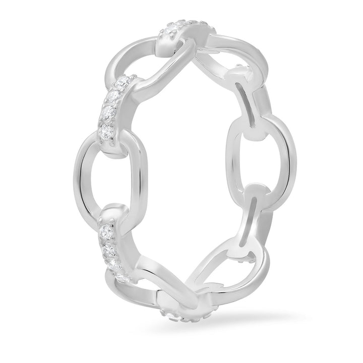 Introducing our Sterling Silver CZ Paper Clip Band Ring, a chic and contemporary piece for your jewelry collection. Crafted from sterling silver, this ring features a sleek and modern design inspired by the popular paper clip motif. Adorned with shimmering cubic zirconia stones along the links, it adds a touch of sparkle to your look. Versatile and stylish, this ring can be worn alone for a minimalist statement or stacked with other rings for a bolder effect. Whether worn casually or for a special occasion, this Sterling Silver CZ Paper Clip Band Ring is sure to turn heads and elevate your style.