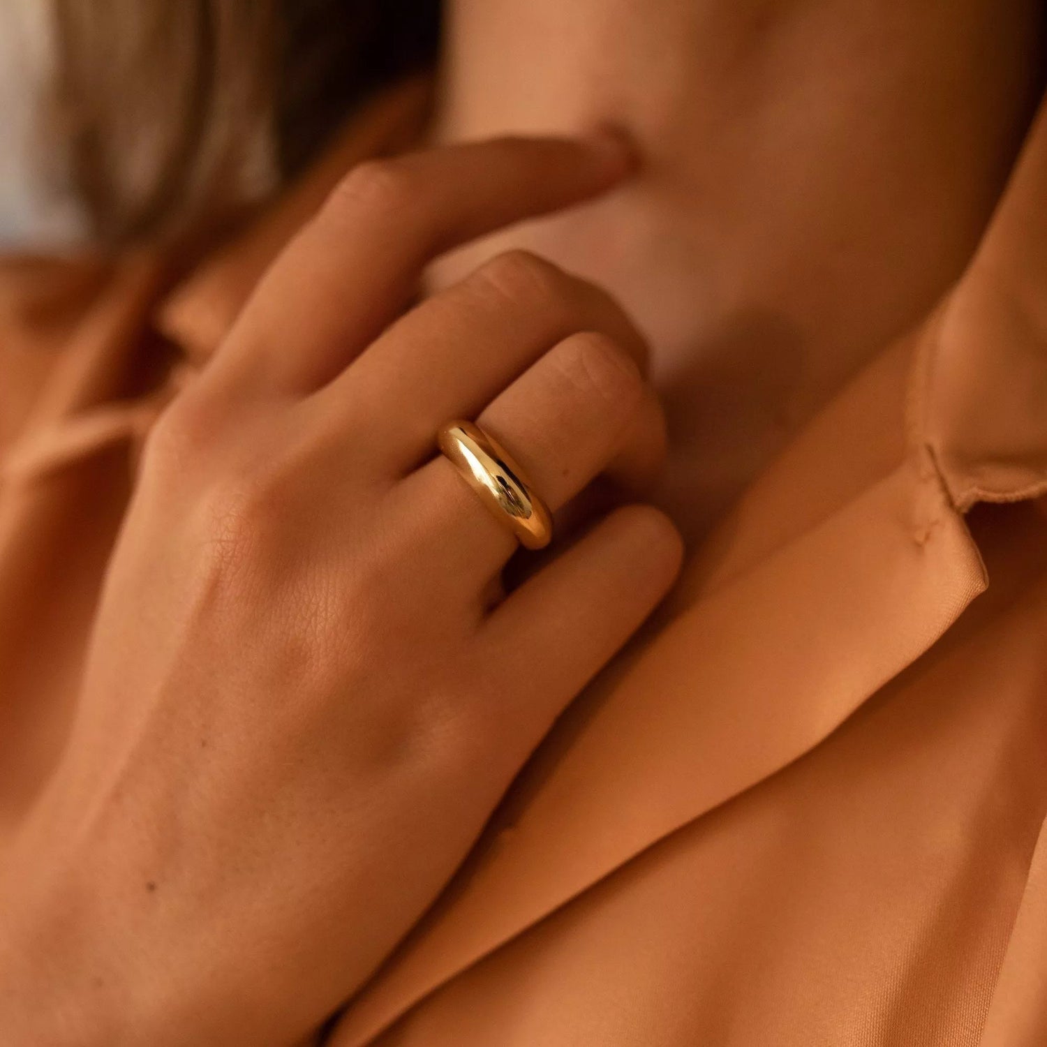 This thick 18K gold plated ring is perfect for anyone that wants a little sparkle! This ring is made from sterling silver, and has then been coated in genuine 18k gold plating. Features a statement smooth hollow polished design.