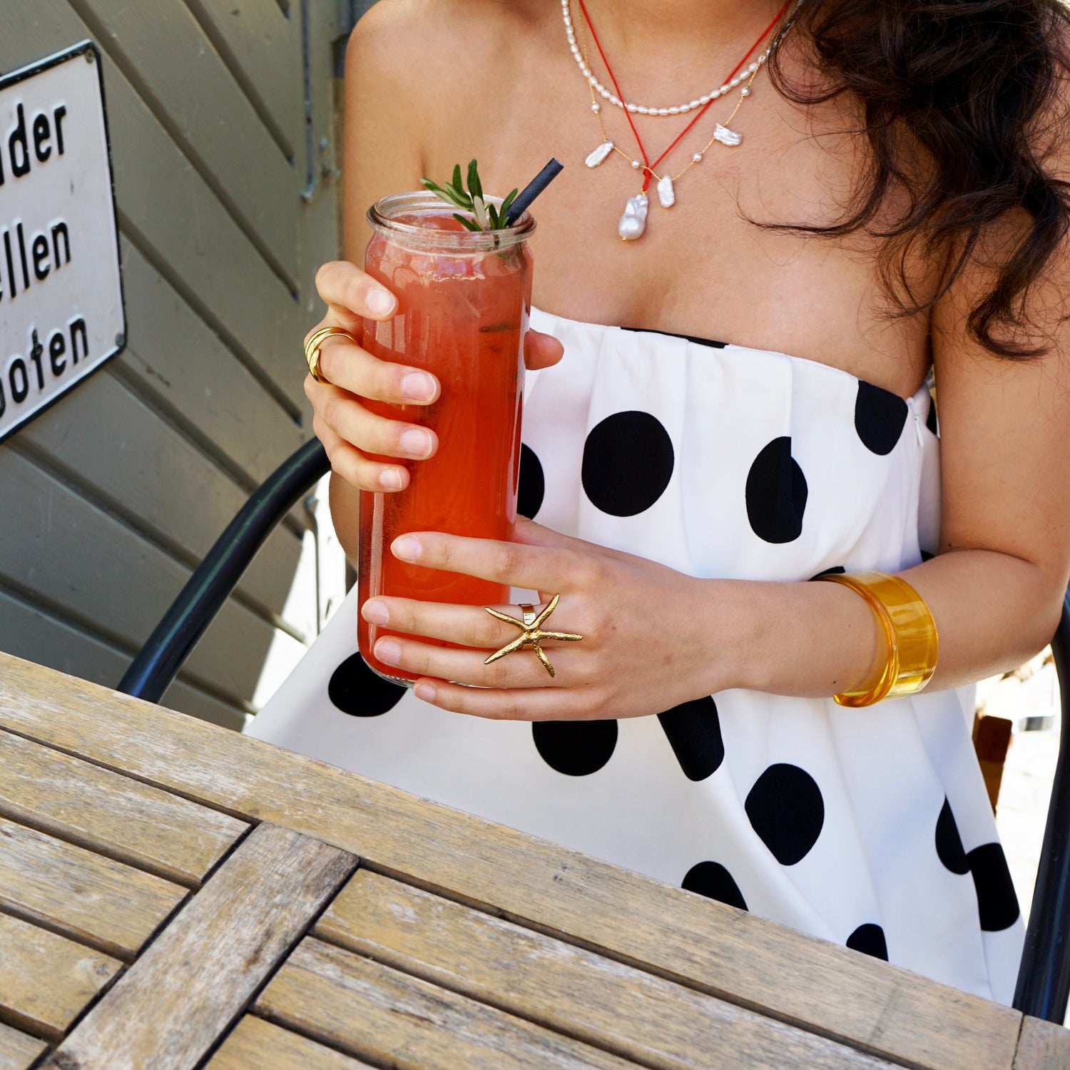 This Ring Seestern by Smilla Brav captures the spirit of the sea in a bold, nautical-inspired design. The intricately detailed starfish motif elegantly wraps around the finger, evoking summer’s charm and marine beauty. Its adjustable band ensures comfort while its waterproof, tarnish-resistant finish makes it perfect for everyday wear. A striking piece that embodies oceanic allure with practicality.
