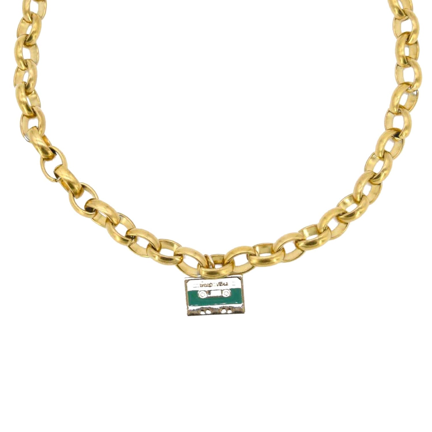 This necklace features a handmade, non-tarnishing stainless steel chain with 18k gold plating. The pendant is an epoxy enamel cassette tape charm.