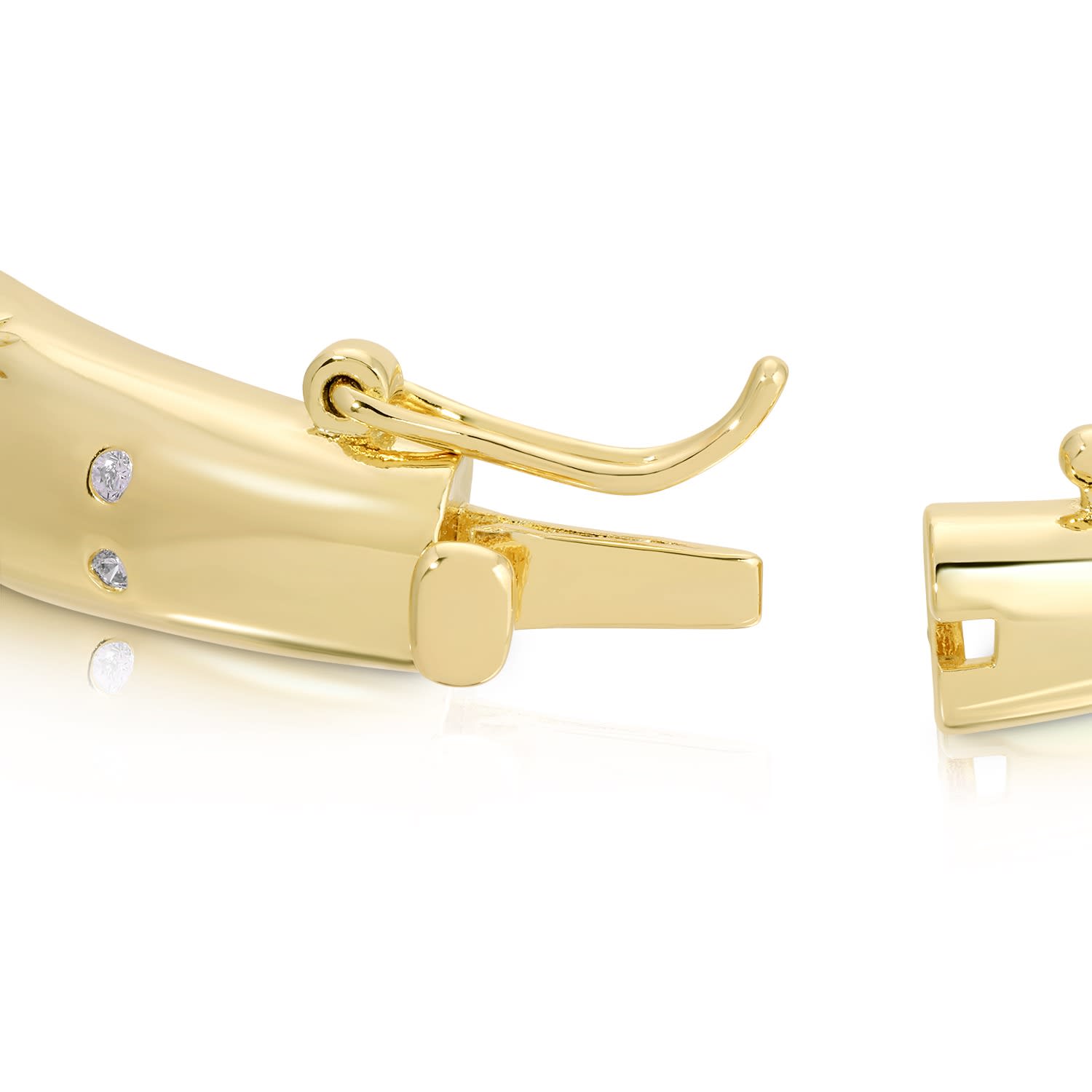 This bangle is a 14k gold piece adorned with sparkling cubic zirconia stones. The description does not specify the base metal.