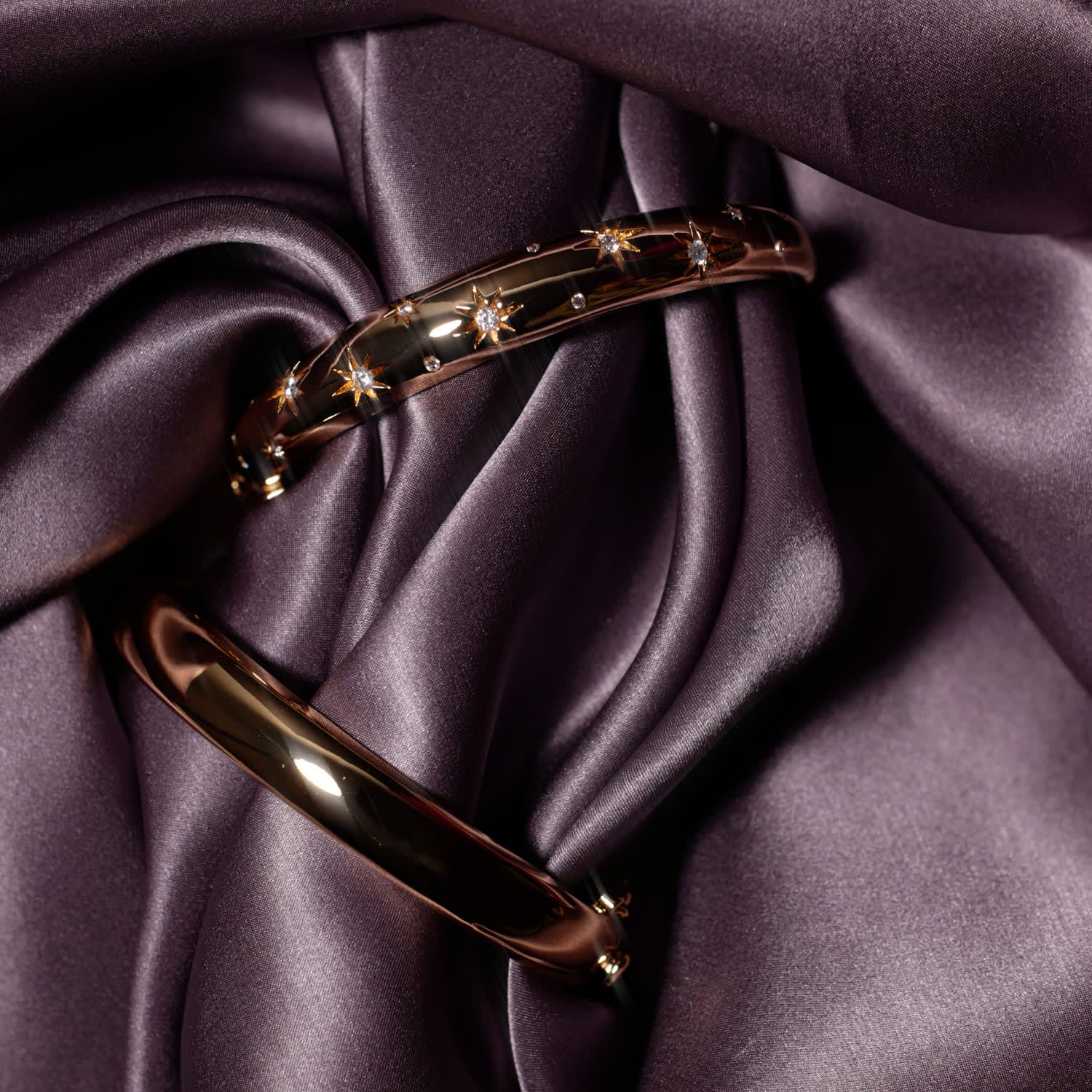 This Stevie Bangle by Leeada Jewelry is a radiant and playful accessory that wraps your wrist in stardust. This 14k gold piece is adorned with sparkling cubic zirconia stones that shimmer like the night's sky, adding a touch of ethereal brilliance to your look. The bangle’s sleek design makes it a versatile piece that can be worn on its own for a luminous glow or stacked with other bracelets for a bolder, more personalized statement.