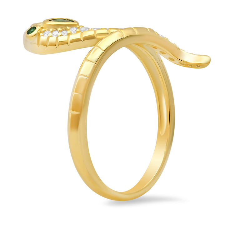 Elevate your style with our Sterling Silver Simulated Emerald and CZ Snake Ring. This captivating piece features a simulated emerald stone set within the intricate coils of a snake design, accented with sparkling Cubic Zirconia Stones along its body. Crafted from high-quality sterling silver, this ring exudes luxury and sophistication. The striking combination of the vibrant green emerald and dazzling Cubic Zirconia Stones creates a bold and eye-catching look. Whether worn as a statement piece or paired with other jewelry, this ring is sure to add a touch of mystique and elegance to any outfit. Embrace the allure of the serpent with our Sterling Silver Simulated Emerald and CZ Snake Ring.