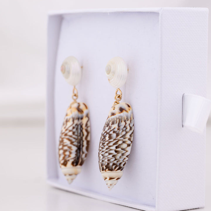 These earrings are made from ethically sourced pearlescent shells and olive shells. They feature 14K Gold-Filled material for the studs.