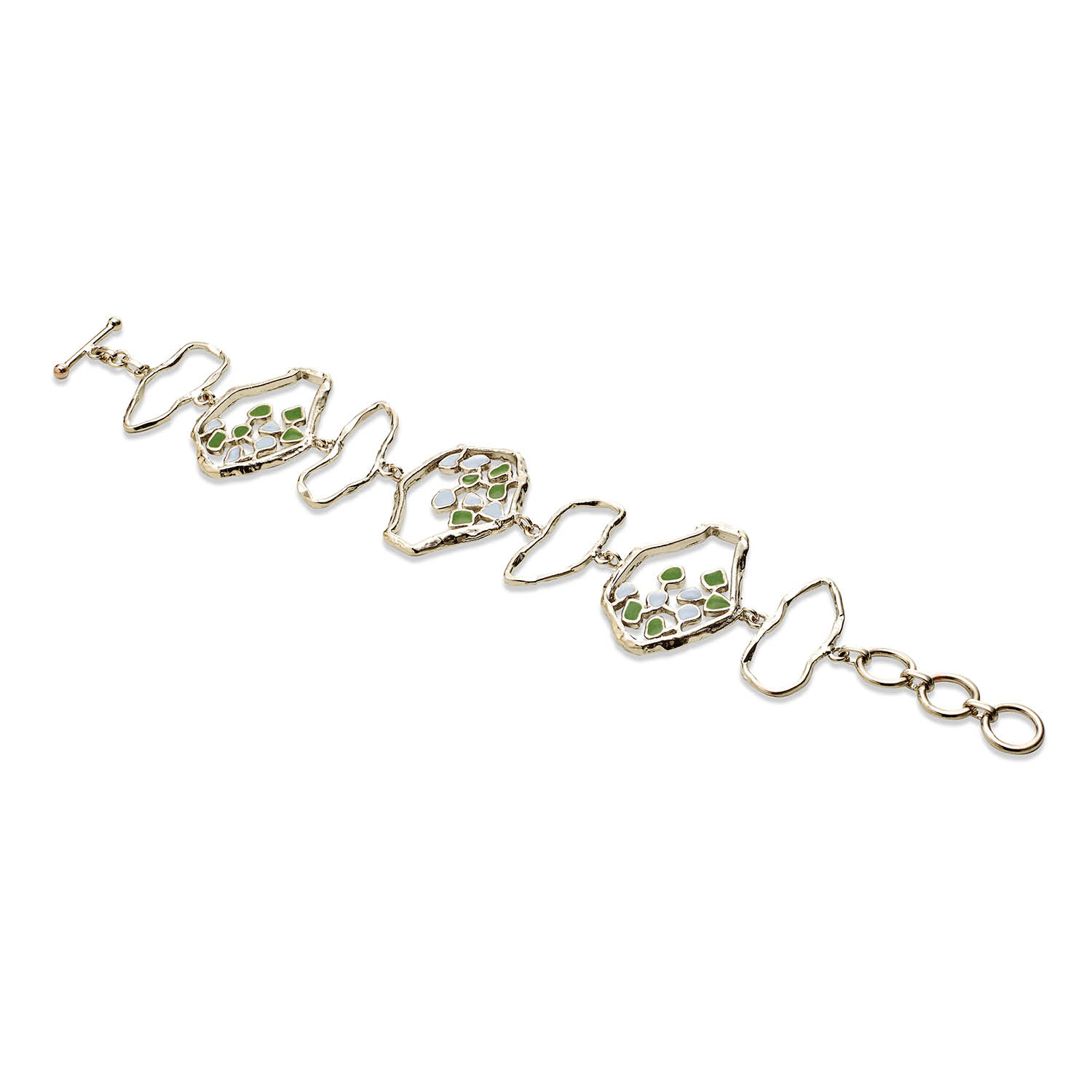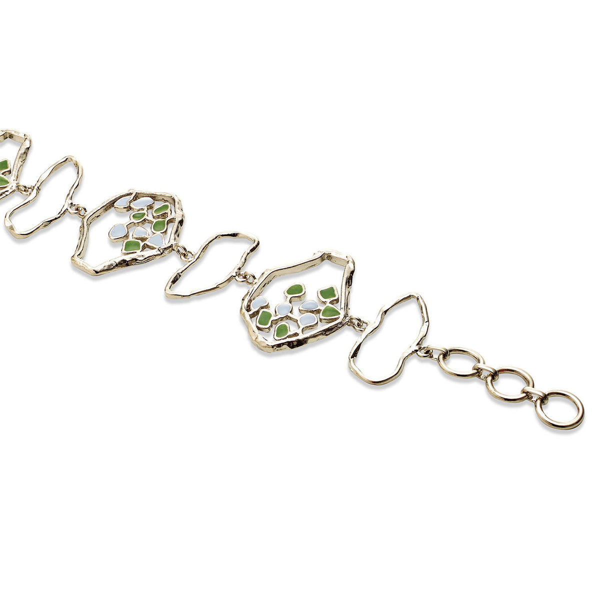 This bracelet is handcrafted in textured brass with pastel blue and green enamel and silver rhodium plating. It is 22k gold-plated or rhodium-plated.