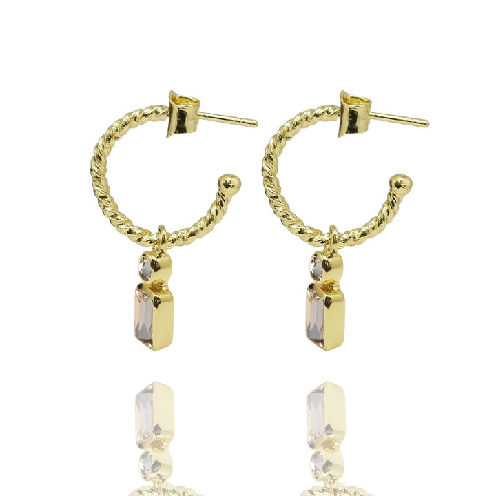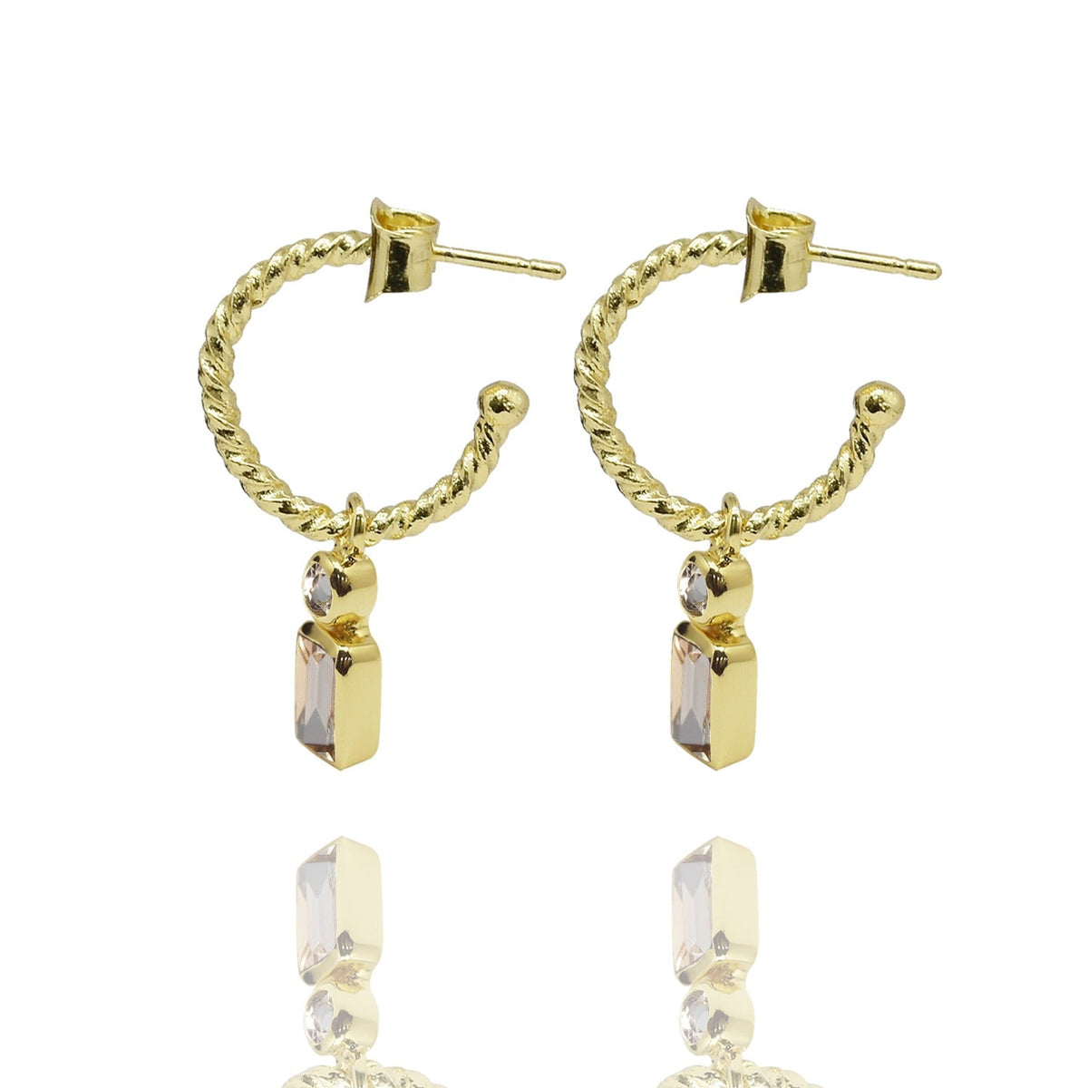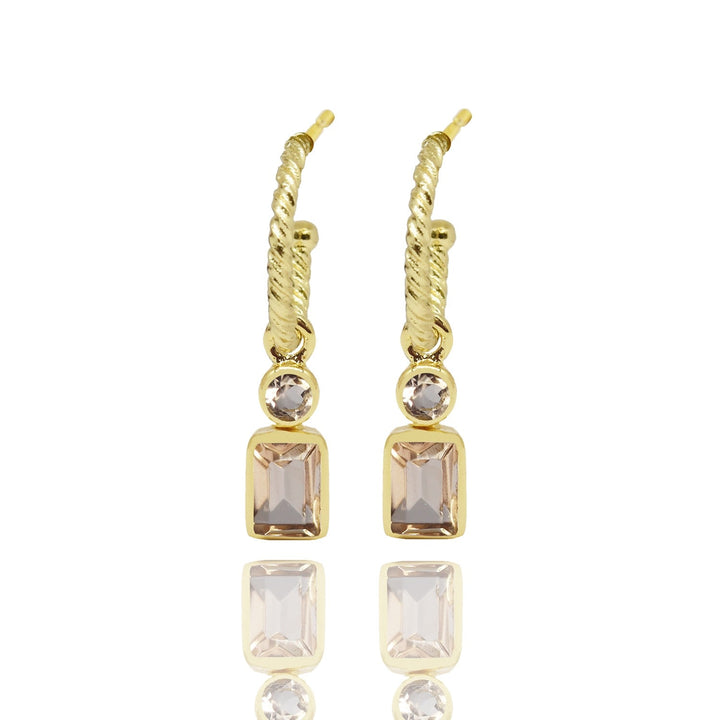 These earrings are handcrafted from 18-karat gold-plated brass and are set with soft pink morganite stones. They are twisted hoop earrings and are hypoallergenic.