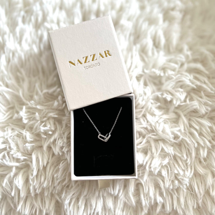 This Silver Pavé Cable Double Linked Pendant Necklace by Nazzar is a contemporary essential with refined detail. Featuring interlinked pendants engraved with cubic zirconia, its sleek design makes it ideal for layering or wearing solo. Both versatile and timeless, it brings a touch of modern elegance to any collection.
