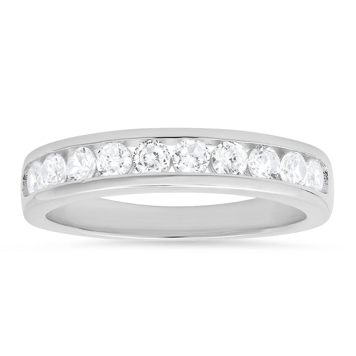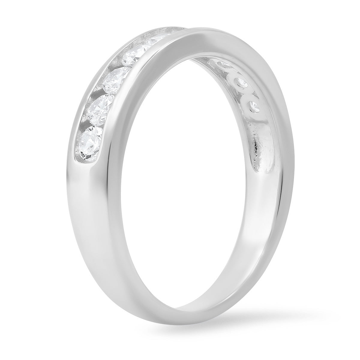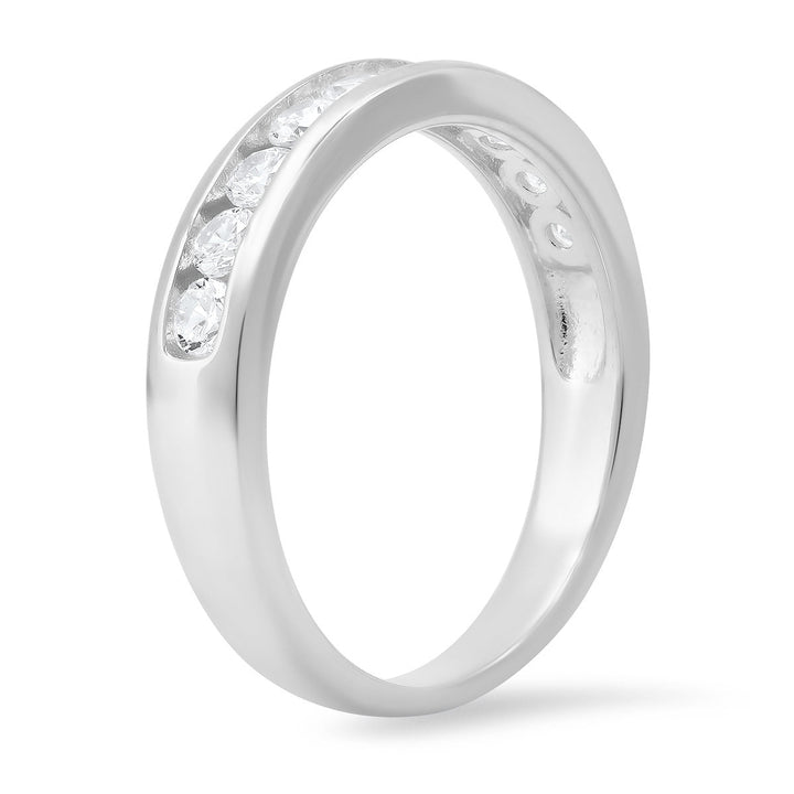 Introducing our Sterling Silver Channel-Set Round Diamond CZ Band Ring, a timeless piece that exudes elegance and sophistication. Crafted from high-quality sterling silver, this exquisite ring features a row of dazzling round-cut diamond Cubic Zirconia Stones meticulously set within a sleek channel setting. The brilliant stones sparkle and shimmer with every movement, adding a touch of glamour to any ensemble. Perfect for both everyday wear and special occasions, this versatile ring is sure to become a cherished addition to your jewelry collection.