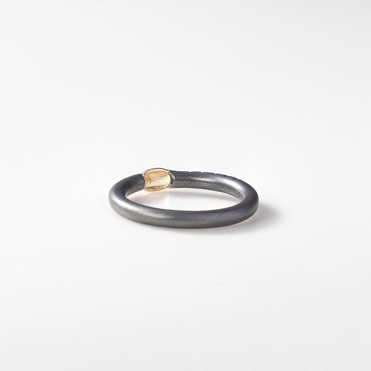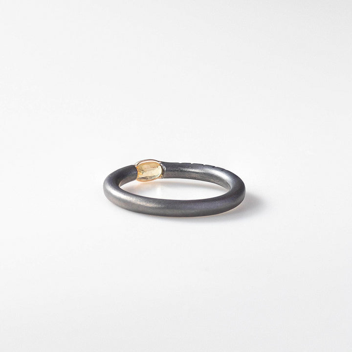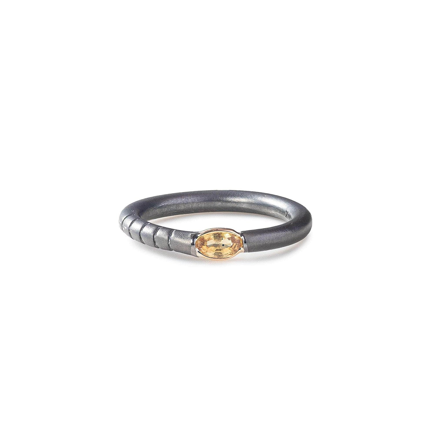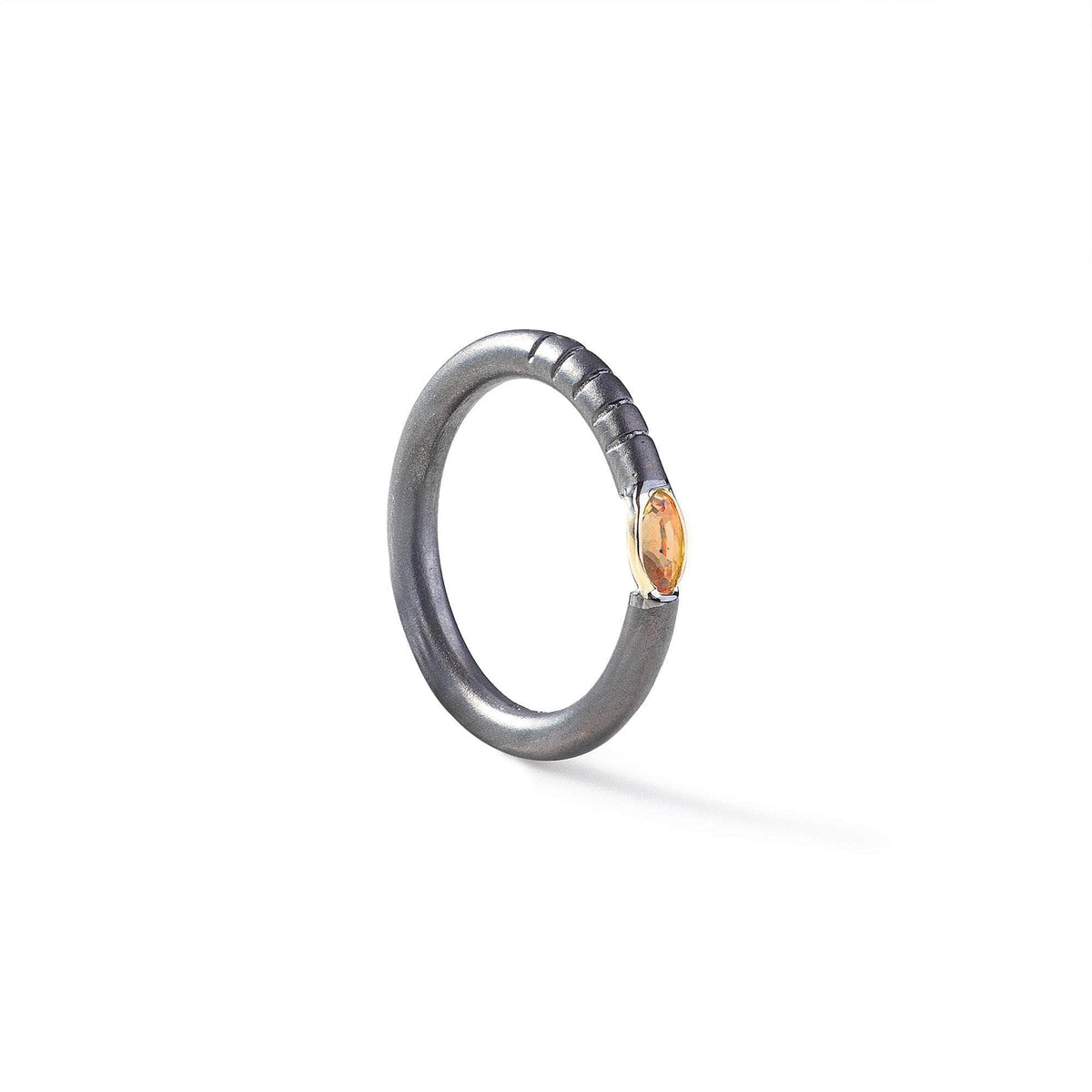 A minimalist designer ring that blends modern elegance with a hint of quirkiness. The 925 Fine Silver band, plated with precious Black Rhodium, provides a contrasting backdrop for the 9K Gold cast embracing a natural orange sapphire in a charming 4x6 mm oval cut. This piece naturally pairs with other rings in the collection. Explore creative combinations with black, grey, or white bands, and mix it up with green or blue sapphire rings in both raw and cut forms. This ring is your modern accessory, making a unique statement about your individual style. Note: Gemstone color may vary depending on lighting conditions. Refer to model photos in diffused light for the most accurate representation. We use only natural gemstones; any inclusions inside are not flaws but rather signs of authenticity.