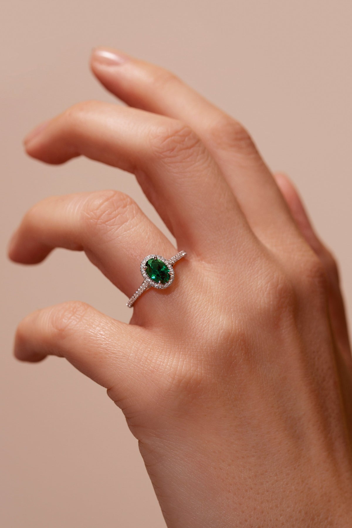 Our Rosalind ring is set with a vibrant green created emerald centre stone framed by a halo of pavé lab grown diamonds. Exquisitely crafted in 9 carat white gold, the lab grown diamonds have a total weight of 0.20ct.