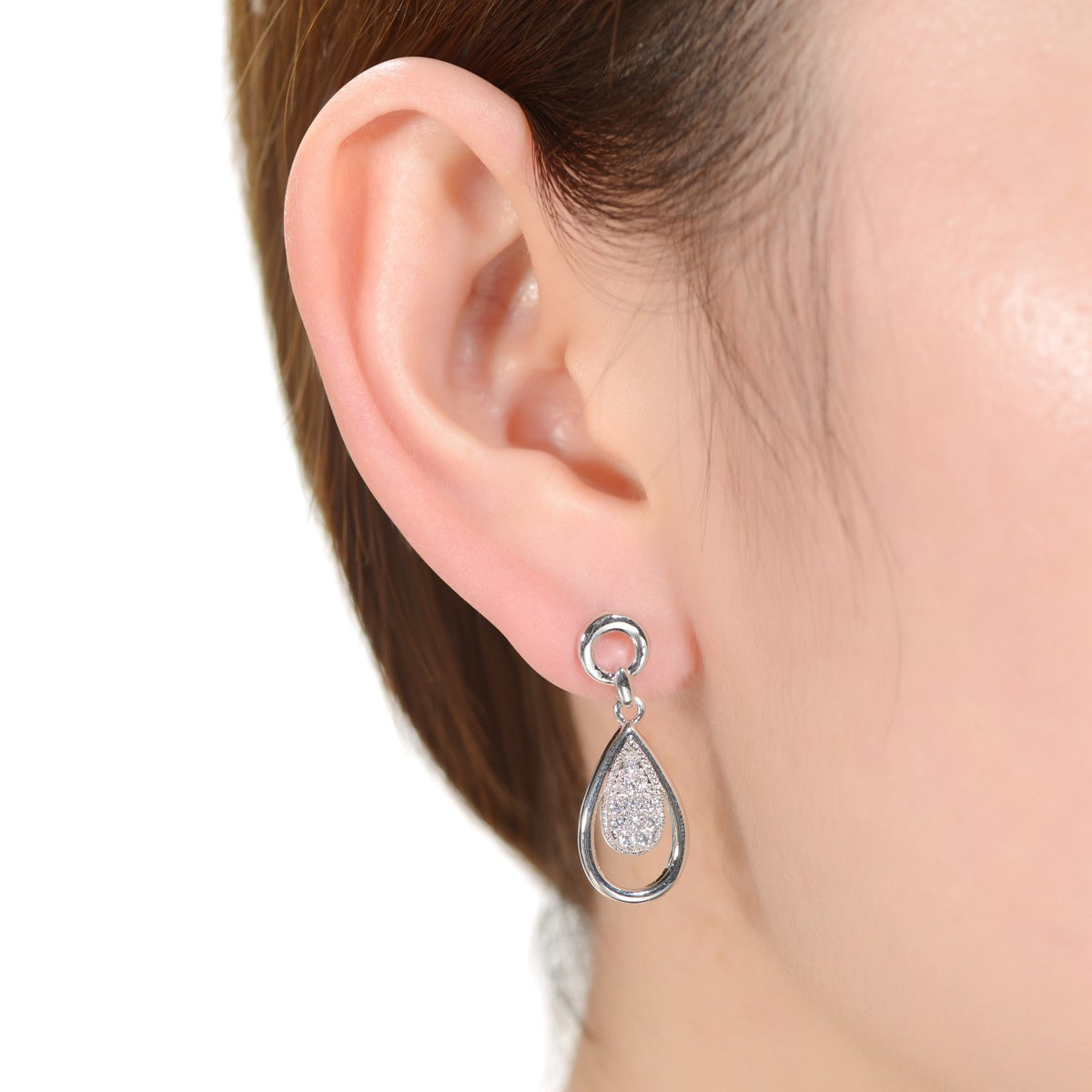These dangling earrings are crafted from white gold plated metal. They feature a pear-shaped frame with clear round and baguette cubic zirconia stones. They are secured with a butterfly clasp.