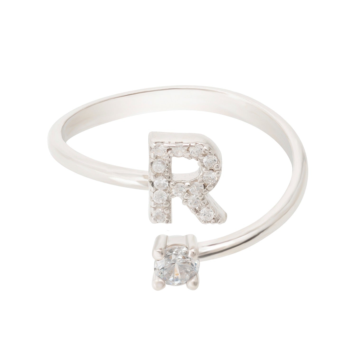 This simple but beautifully styled initial letter ring is perfect for those who covet delicate jewellery with a hint of sparkle offering a sophisticated finishing touch to any outfit. Pretty and petite, this initial ring features an open band, which allows for slight adjustability with sizing. The opening is designed to be on top of your finger, where your zircon adorned monogram is on one side and a single larger cubic zirconia resides on the other. This ring looks great stacked with other rings. What can be more personal than a name? Give this initial ring as the perfect personalised birthday gift.