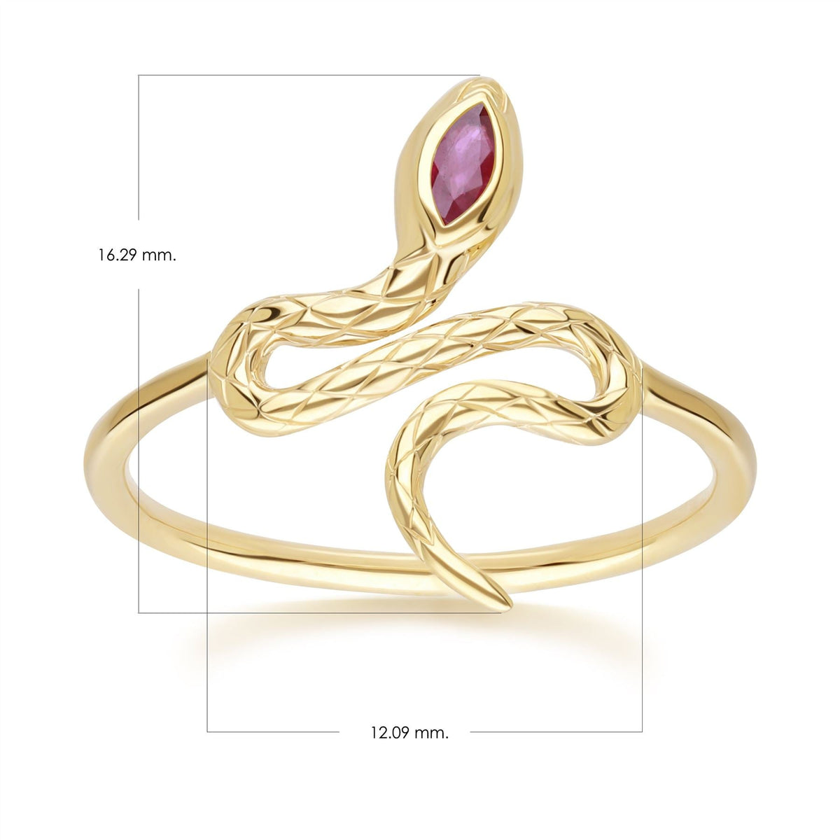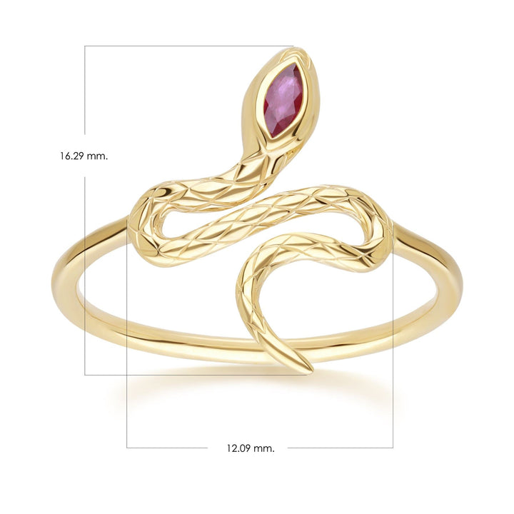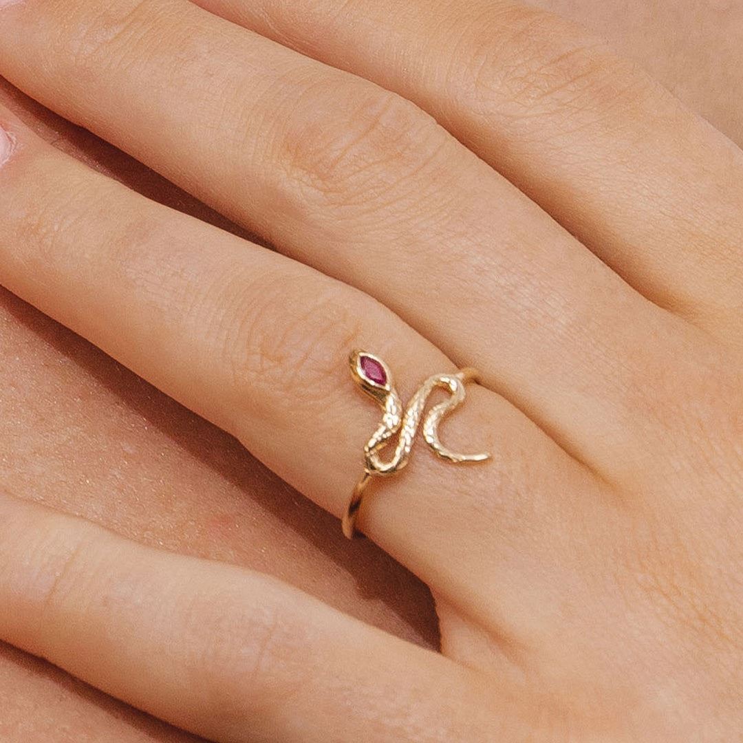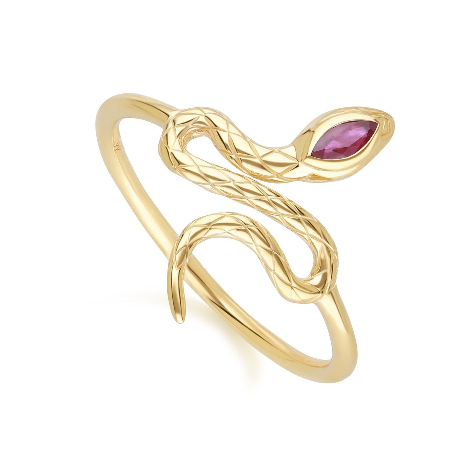 A beautiful yellow gold snake ring decorated with Ruby gemstone in an elegant winding design. Snakes are symbolic of renewal, making this ring perfect for those celebrating a new start.