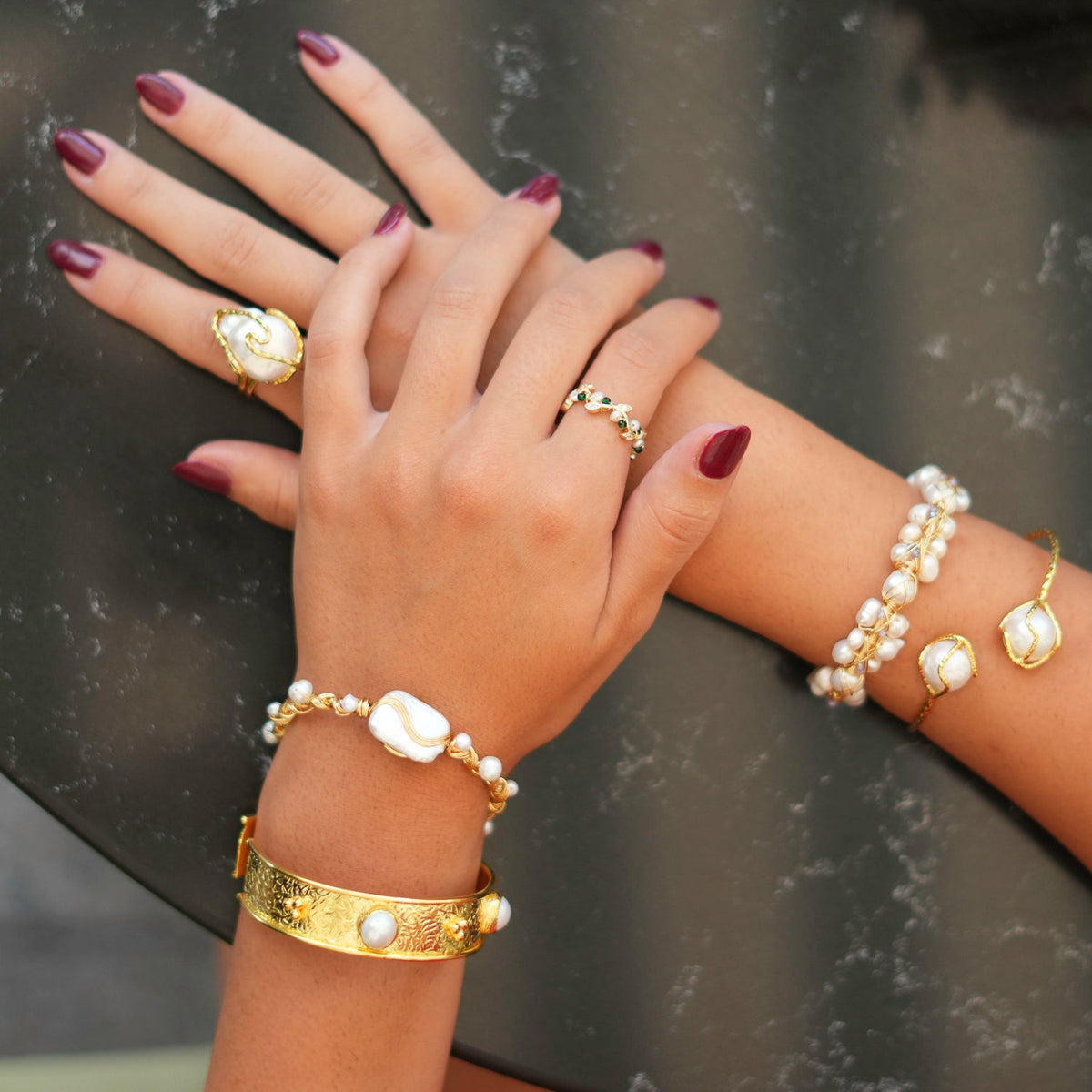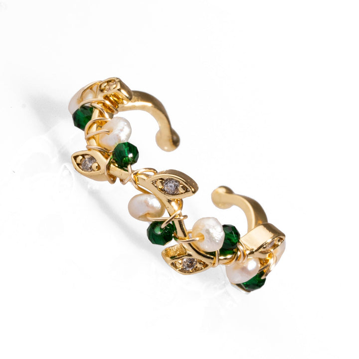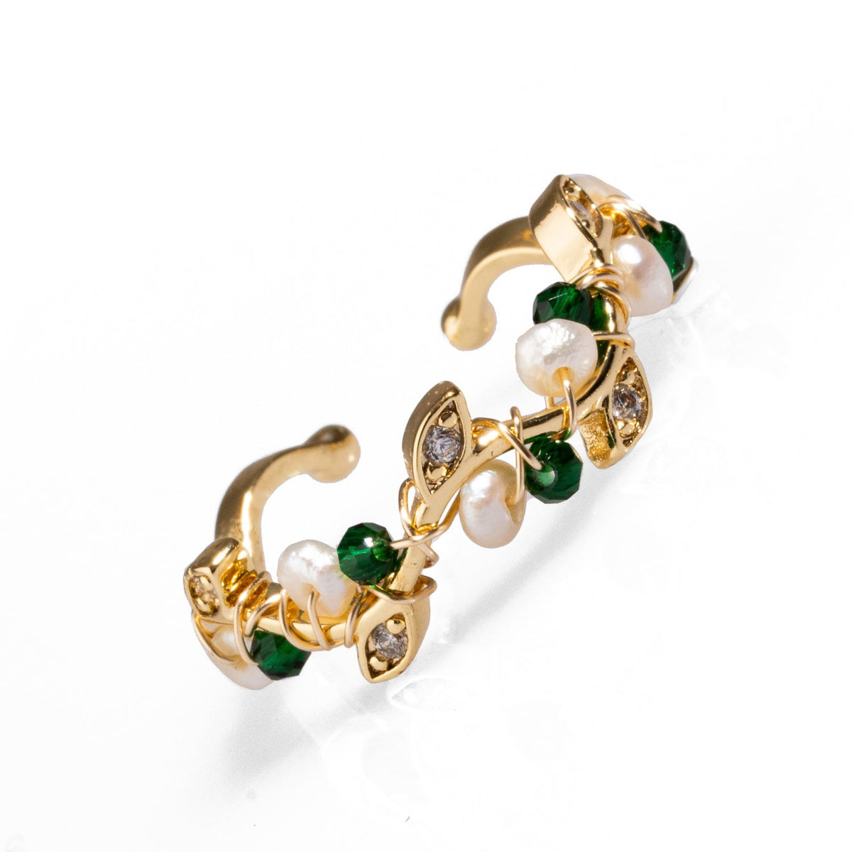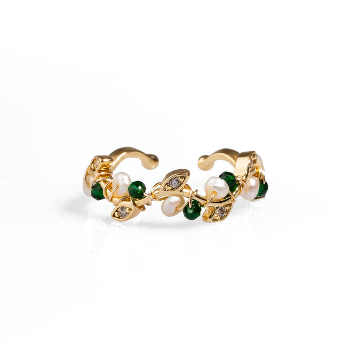This Cleopatra Pearl & Jade Floral Minimalist Dainty Ring - Green by Ebru Jewelry celebrates timeless beauty with nature-inspired elegance. Featuring delicate pearls and jade stones framed by golden leaves, the ring embodies femininity and renewal. Its adjustable fit adds versatility, making it perfect for everyday wear with a touch of mystique.