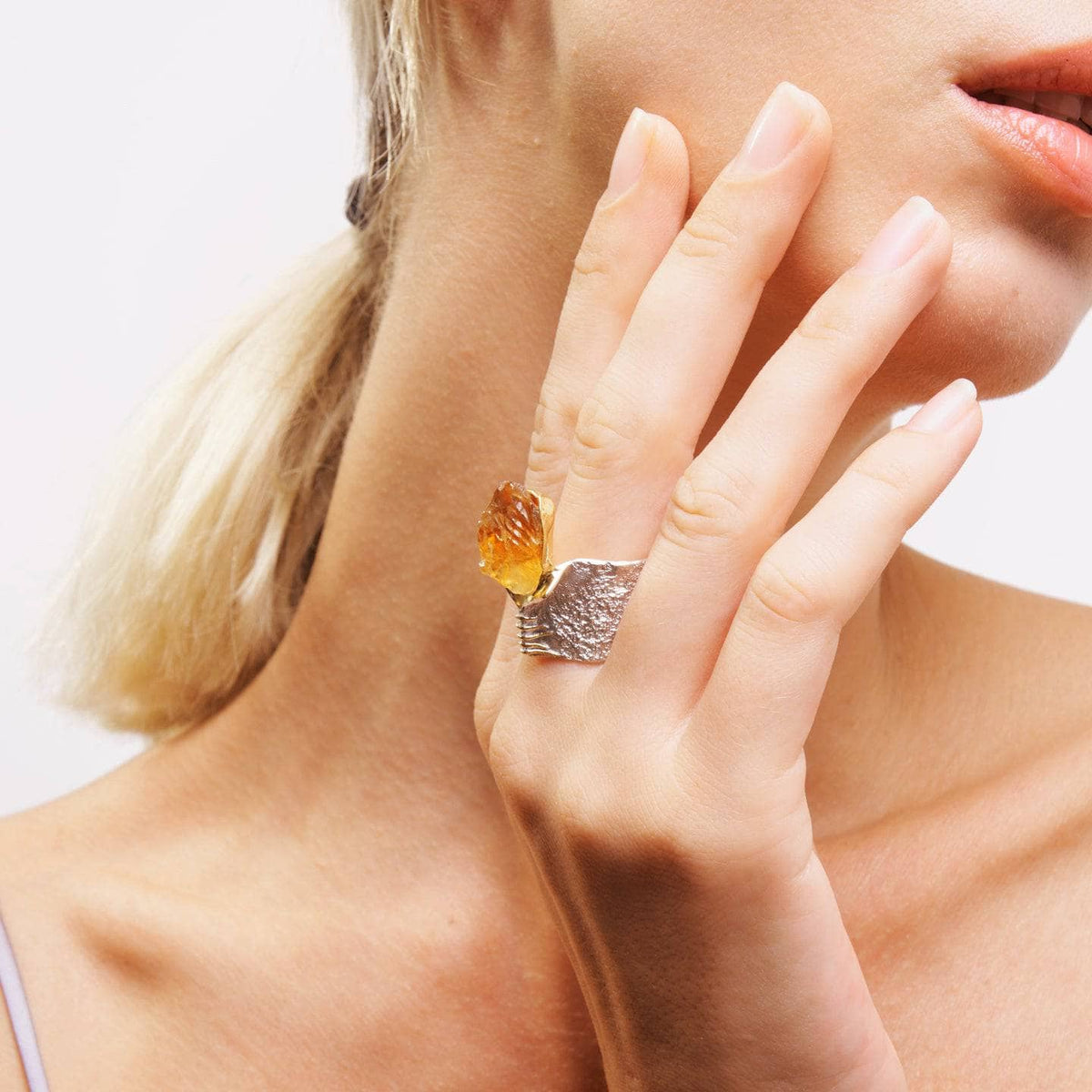 A beacon of light emerges from its white rhodium landscape. A ring of contrasts and truths it vibrates with raw energy and life. A rough citrine provides heat and electricity that makes a perfect marriage with glimmers of yellow gold.