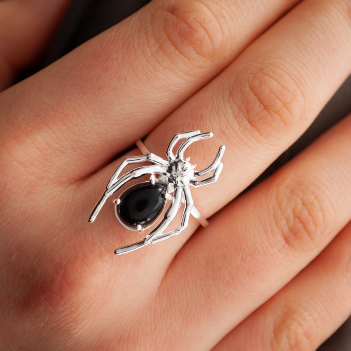 This beautiful Spider ring is made of Sterling Silver and features a natural pear-shaped Black Onyx Cabochon. Our Sterling Silver jewelry pieces are hypoallergenic and tarnish-resistant. Our rings are meticulously handcrafted and hand-polished to perfection. They are made to last a lifetime with proper care.