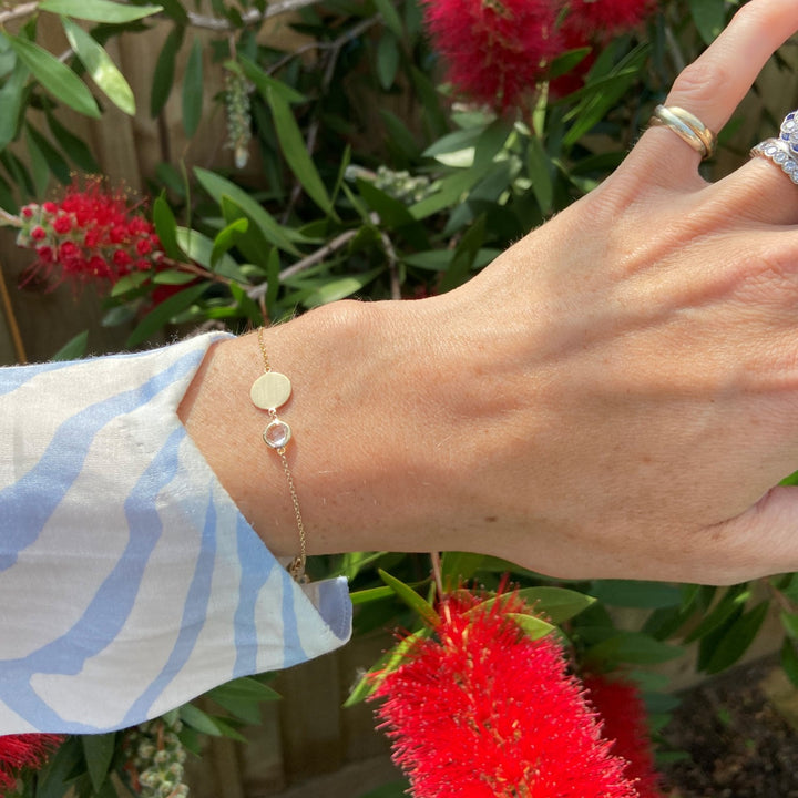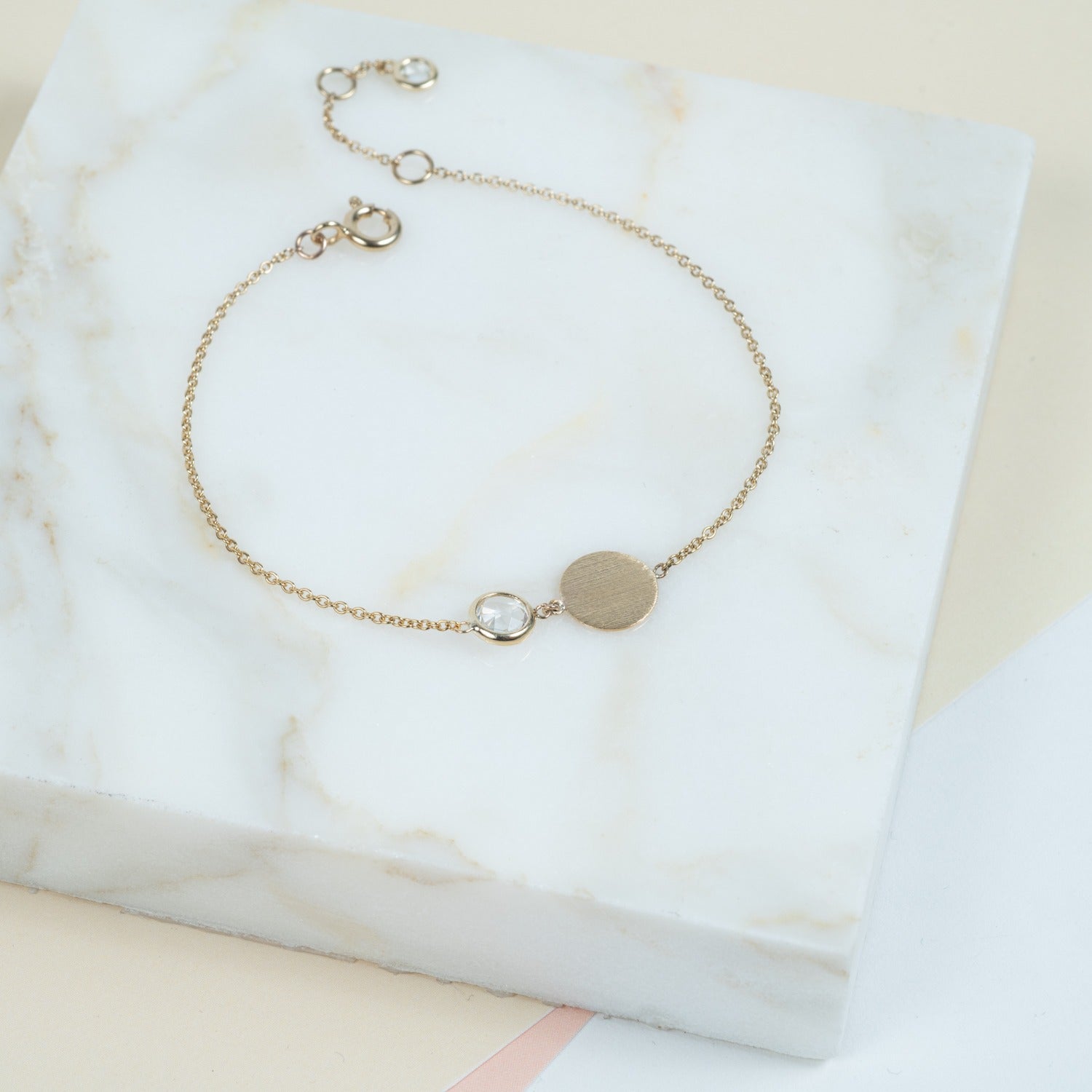 Our beautiful 9ct Gold White Topaz gemstone bracelet is part of the Bali Birthstone Collection. The 9ct gold disc, which can be engraved with a name or special date, is polished on one side and brushed on the other, so you can wear it either way around. The hand set gemstone, White Topaz displays protective properties such as healing & power. The stone also symbolises hope, love and happiness. And a small matching gemstone sits at the clasp which is adjustable to get the right fit. Each bracelet is hallmarked by the London Assay Office with our feature Auree hallmark.