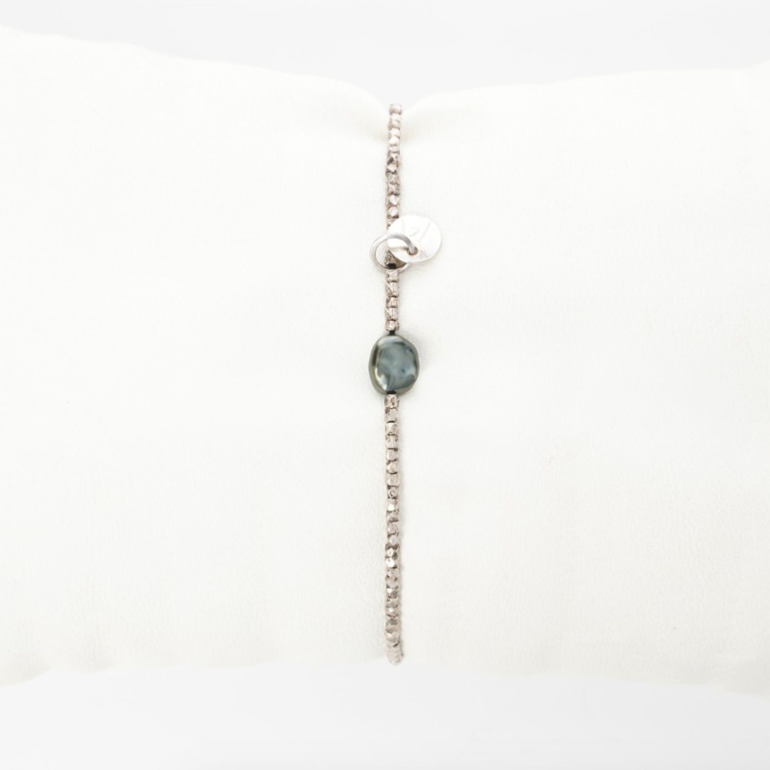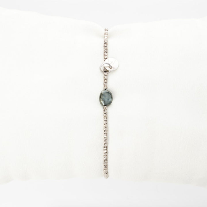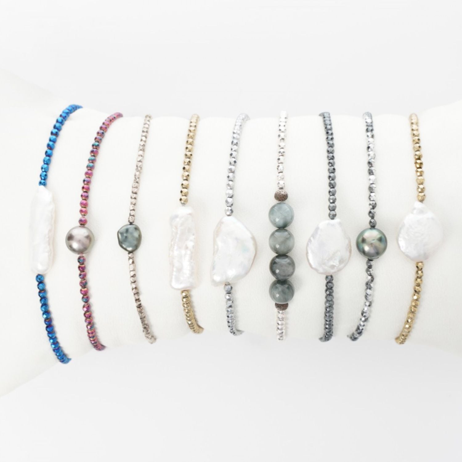 This bracelet is adorned with hematite, Tahitian pearls, and mother-of-pearl.