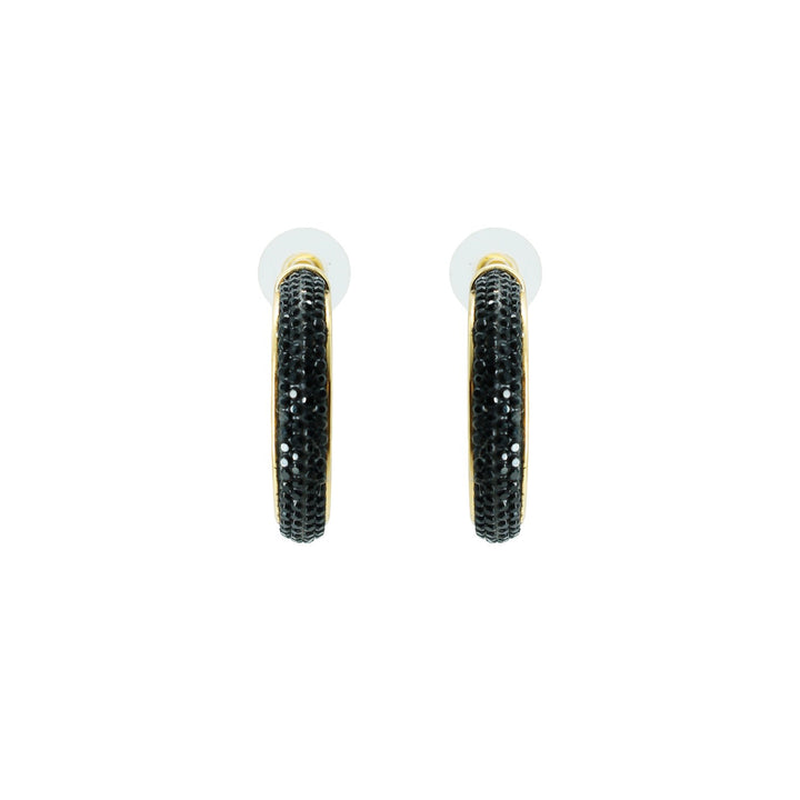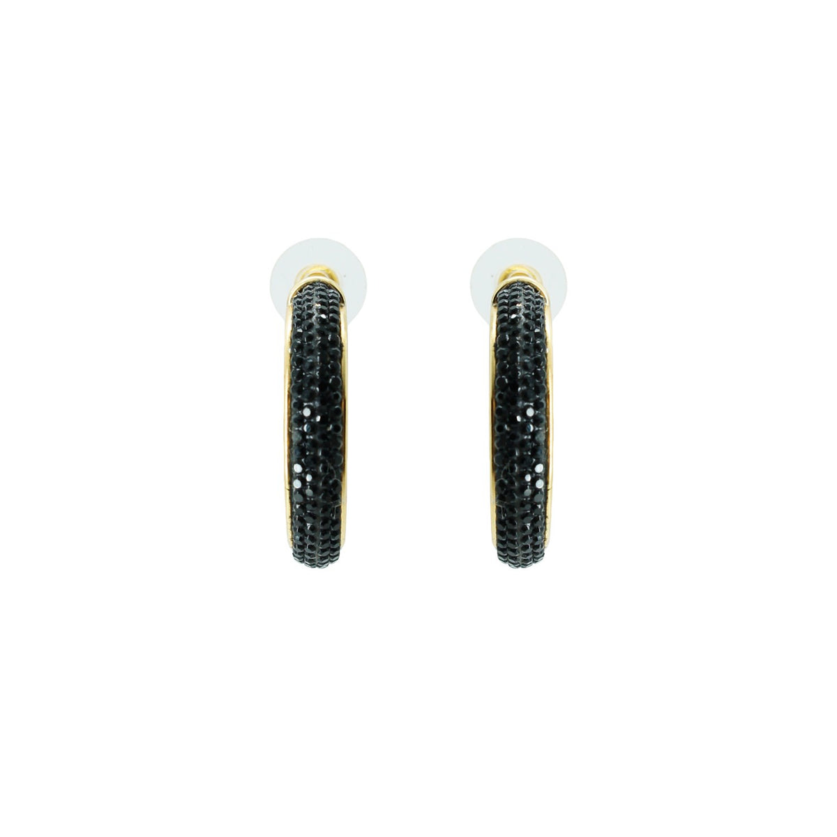 These hoop earrings are handmade with a Zamak base and feature glass rhinestones, a gold finish, and a stainless steel pin.