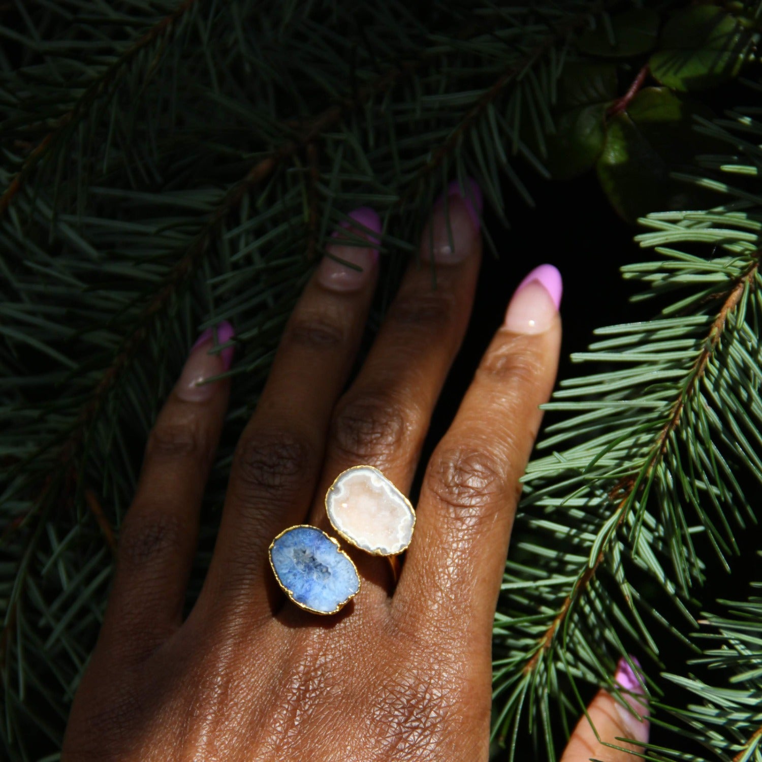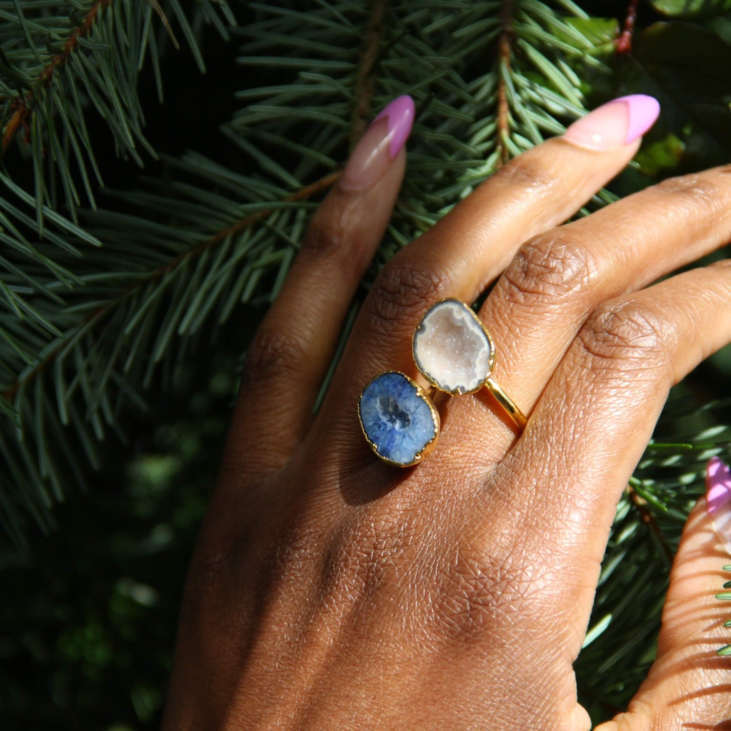 Stunning semi-precious statement ring in attractive natural white/grey and denim blue shades. The gemstones are encased in gold plating on top of strong brass metal. The colour intensities, stone sizes and shapes vary from ring to ring making each item unique. A beautifully created handmade ring at an affordable price.